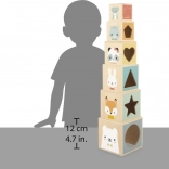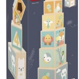 Ez a 6 kockából álló fa piramis finom színeivel és szeretetteljes illusztrációival nyűgöz le. A gyerekek a kockákat rakosgathatják, válogathatják és átfűzhetik, ezáltal jobban megértik az egyensúly, a méretek és a tér összefüggéseit. Minden kockának 5 különböző oldala van: egy aranyos állat, egy állat a környezetében, egy kis állat színes háttéren, számjegyek az első számoláshoz és egy kivágott forma, amely két kocka összeillesztésével vidám képet tár fel (például cica egy szívben).