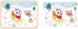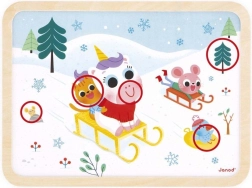 A JANOD fa kirakó szánkózás témával ideális választás első kirakóknak. A masszív daraboknak és a peremmel ellátott alaplapnak köszönhetően könnyebb a kezelés, és gyorsabb a sikerélmény. A kép befejezése után szórakoztató kihívás következik – megkeresni a mintához képest a különbségeket, ami támogatja a koncentrációt és a vizuális észlelést.