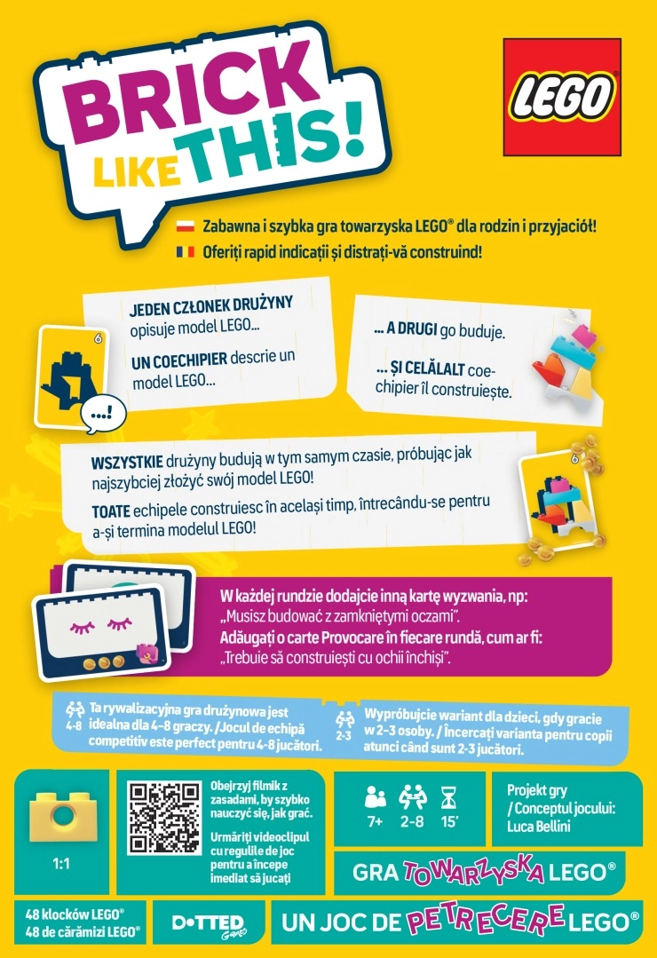 Élvezd a hat pörgős kört, amelyekben a játékosok felváltva lesznek instruktorok és építők. A 92 alakzatkártyának és a 20 kihíváskártyának köszönhetően a játék sosem válik egyhangúvá – új szabályokat, korlátozásokat és mókás csavarokat ad hozzá. Mindenki egyszerre épít, így a feszültség és a versenyszellem garantált.