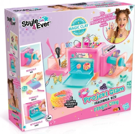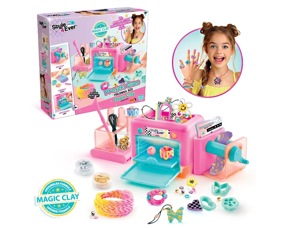 A Glam – Pracownia Biżu készlet ideális 6 éves kortól azoknak a kis alkotóknak, akik szeretik a divatot és szívesen próbálnak ki új technikákat. A speciális gyurmás anyag könnyen formázható és gyorsan keményedik, így az ötlet hamar kész ékszerré válik. A mellékelt keményítő berendezéssel az alkotások tartósak lesznek, és készen állnak a viselésre vagy ajándékozásra.