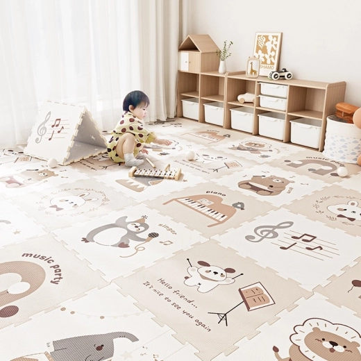 Az Állati parti hab játékszőnyeg 9 darab négyzet alakú elemből áll, amelyek pontosan illeszkednek egymáshoz, és 180 × 180 × 2 cm-es kényelmes felületet alkotnak. A puha, tartós és biztonságos anyag kellemes felületet biztosít az első hason fekvésekhez, kúszáshoz és játékhoz. A zenészként megjelenített aranyos állatok és a kotta motívumok ösztönzik a gyermeki képzeletet és fejlesztik az érzékszervi észlelést.