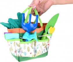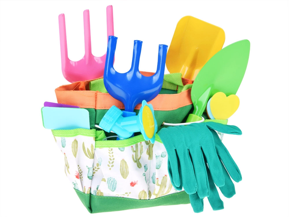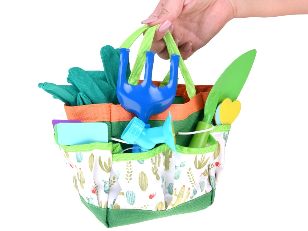 A vidám kaktusz mintás, teljes gyermek kerti készlet friss levegőn való tanulásra és játékra inspirál. Tartalma: praktikus zsebes táska–rendező, színes, kis kezekhez való szerszámok, locsolókanna, kötény, kesztyű, védők és színes növényjelölők. Ideális ásáshoz, lazításhoz, átültetéshez és öntözéshez, valamint a természethez fűződő kapcsolat erősítéséhez.