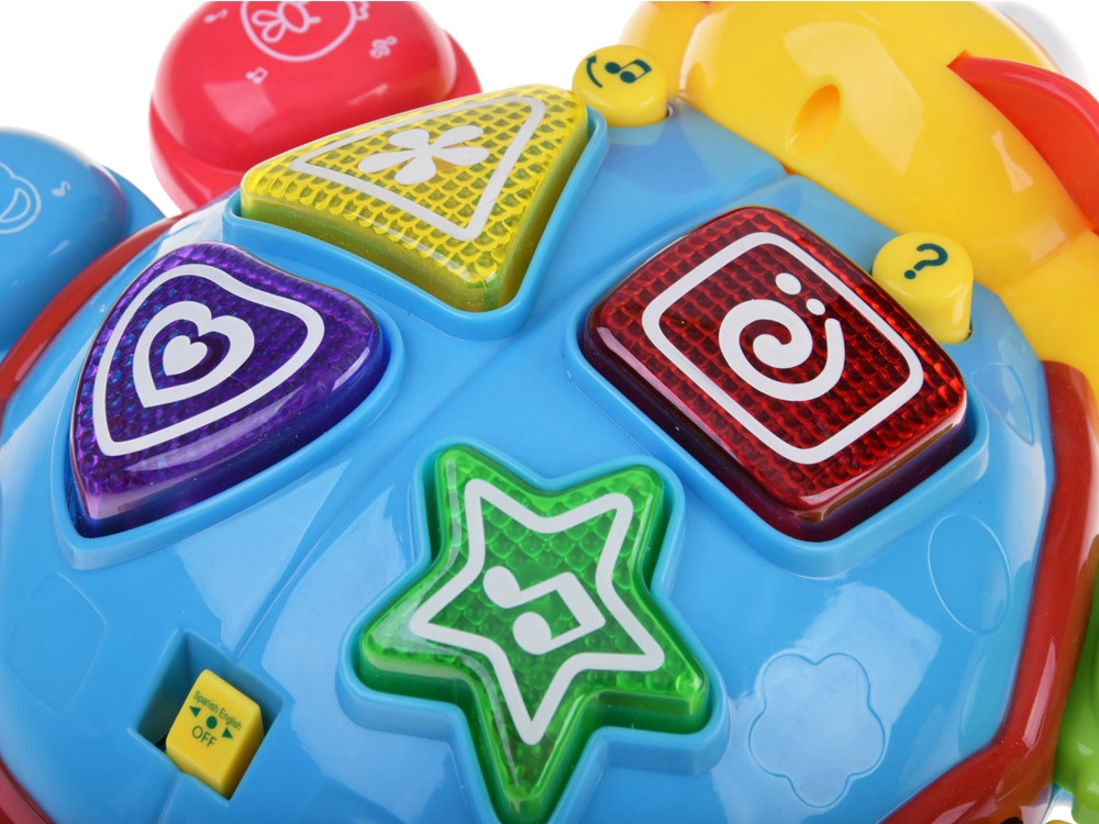 A színes gombokon színek és állatok láthatók – megnyomásukra a bogárka kimondja a megfelelő színt és állatot (elérhető angolul és spanyolul). A kérdőjeles gomb egyszerű feladatokra („hol a zöld?”) kérdez rá, ezzel támogatva a játékos tanulást.