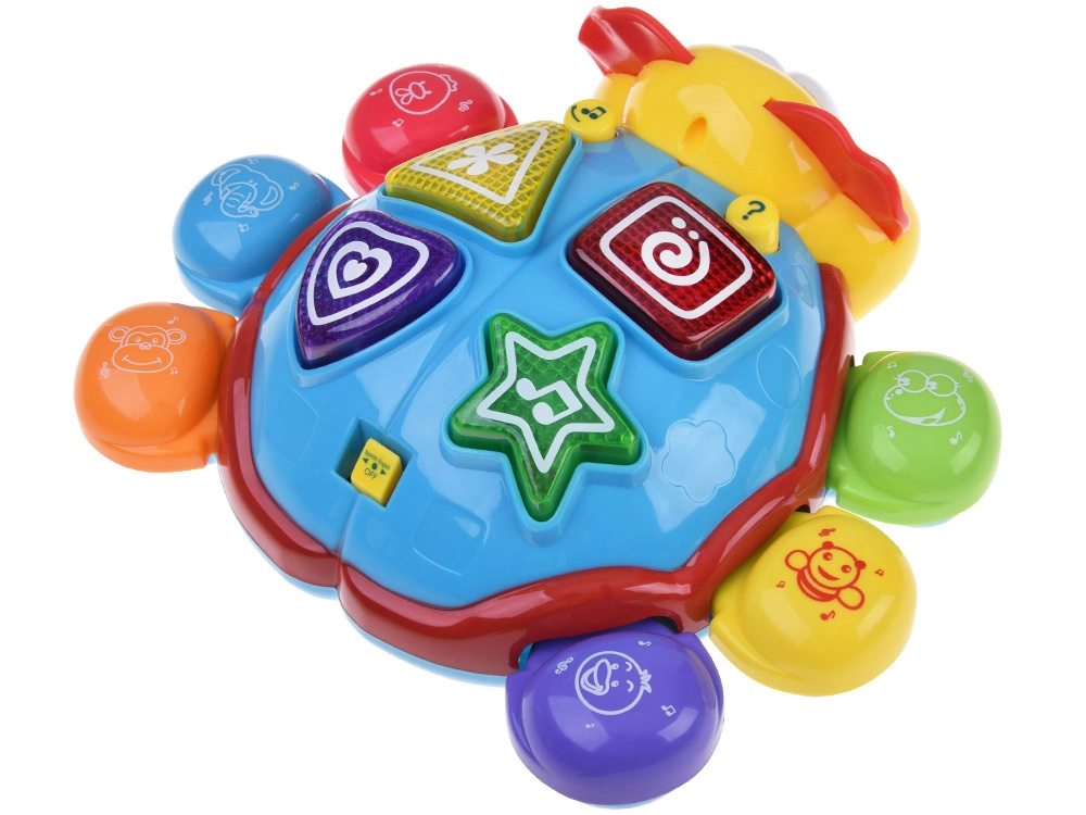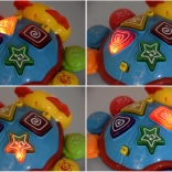 A színes gombok megnyomásával a gyerekek megismerkednek a színekkel és az állatokkal; a kérdőjeles kvízgomb egyszerű feladatokra hív.