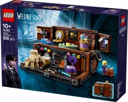 A LEGO Wednesday – Thing szobája bőröndben (76785) órákon át tartó kreatív játékot és látványos kiállítást kínál. A nyitható barna bőrönd két szintes jelenetté alakul ággyal, fotellel, asztalkával, létrával és dekorációkkal. Felül hely van matricáknak, körömlakknak és kézkrémeknek, emellett számos meglepetés kiegészítő gondoskodik a történetmesélős játékról.