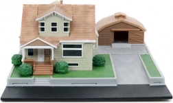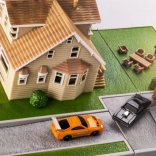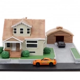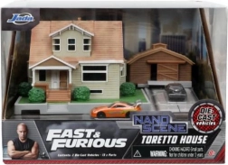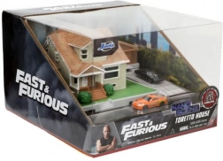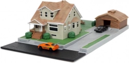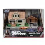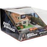 Hű megjelenítés a Toretto-házról házzal, garázzsal, feljáróval és kerttel egy talapzaton – tökéletes kiállításhoz.