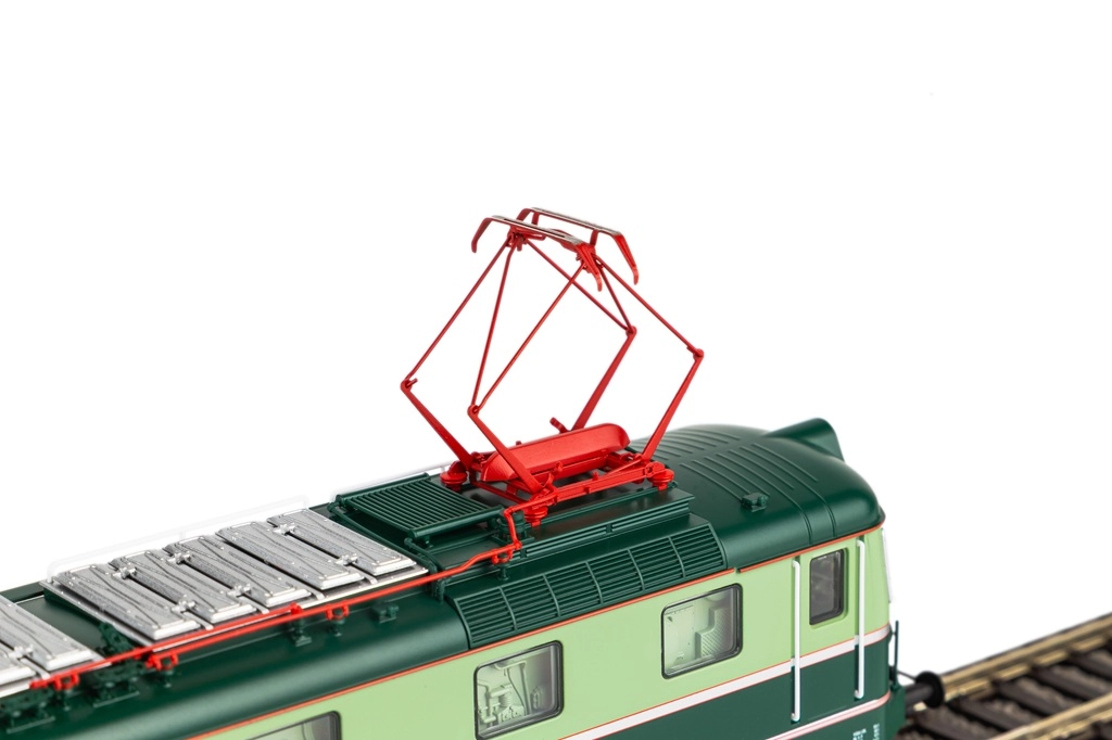Két fém ollós áramszedő, kerek ütközők és gazdagon részletezett tető- és kasznielemek biztosítják a ČSD mozdony hű megjelenését.