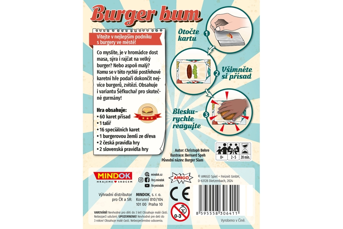 Válj a gyors burger-építés mesterévé a pörgős Burger Bum kártyajátékban! Pakold az összetevőket a tányérra, találd el, mikor kész a burger, és kapd el időben a bucikat. Gyors játékmenet, izgalmas reflexpárbajok és szórakozás az egész családnak 8 éves kortól.