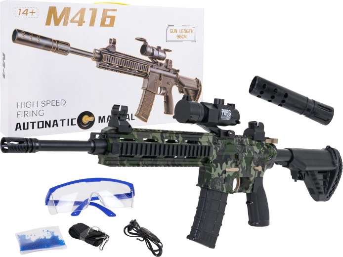 Nagy M416 gél blaster szórakoztató csatákhoz 7–8 mm-es vízgolyókkal, akciót visz a lakásba és a szabadba is. Kínál manuális és automata lövési módot, állítható irányzékot a pontosabb célzáshoz, valamint 7,4 V-os akkumulátoros tápellátást USB töltéssel. A csomag mindent tartalmaz, ami szükséges, beleértve a védőszemüveget, csővéget (tompítót), tárat, hevedert és 500 db gélgolyót az előkészítéshez.