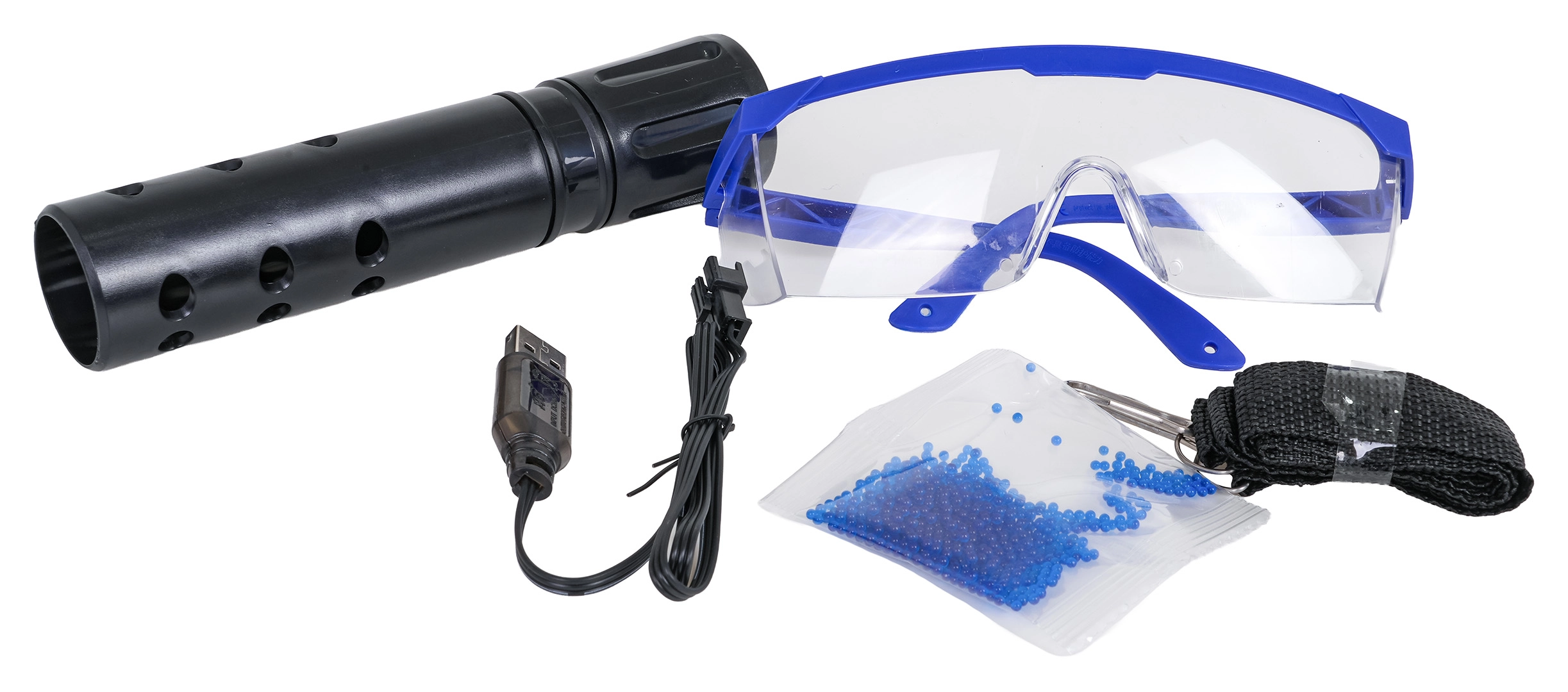 - M416 blaster, tár, csővég (tompító), irányzék, USB-kábel, 7,4 V-os akkumulátor, kb. 500 db előkészítendő golyó tasakban, heveder, védőszemüveg, használati útmutató