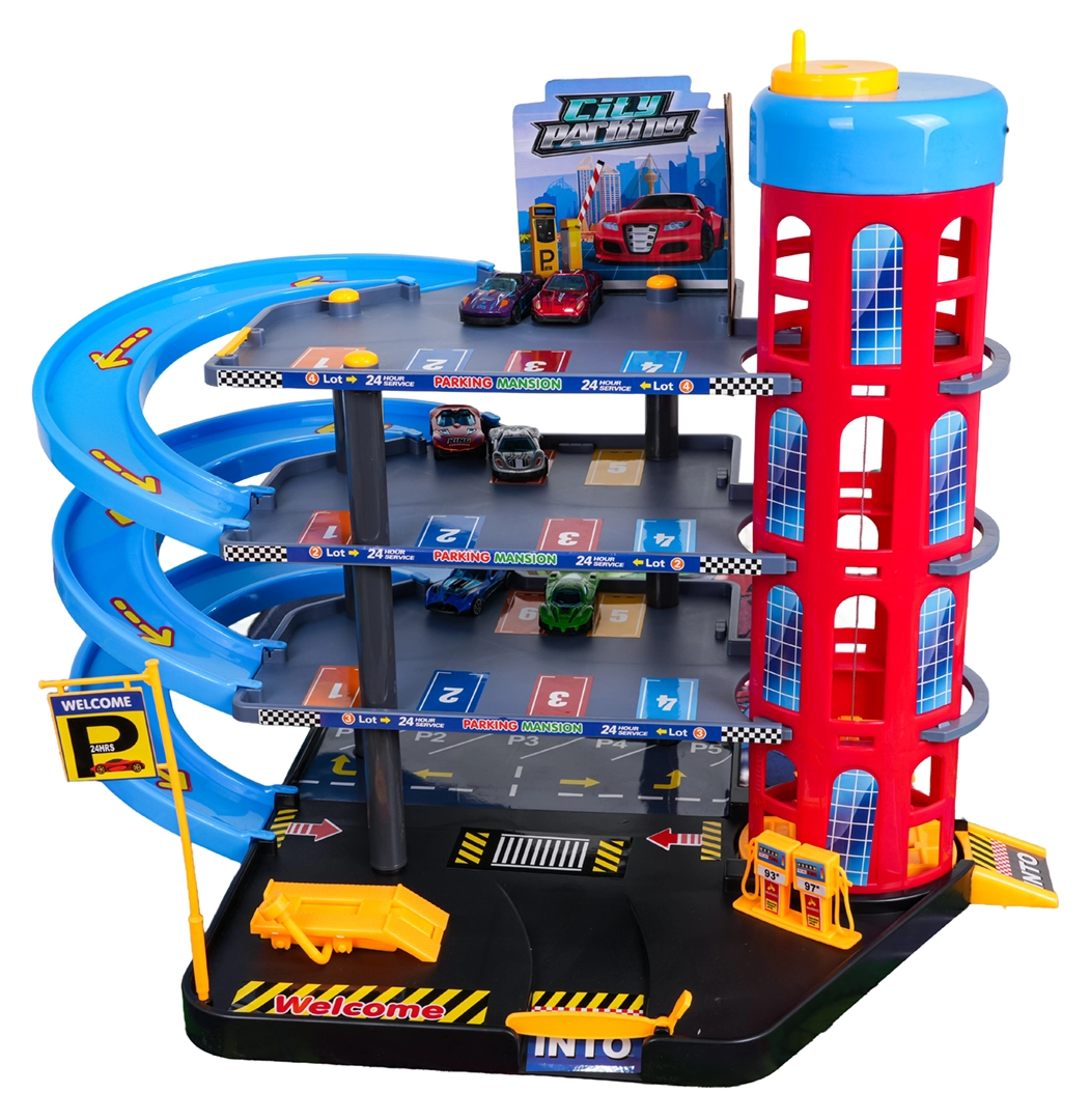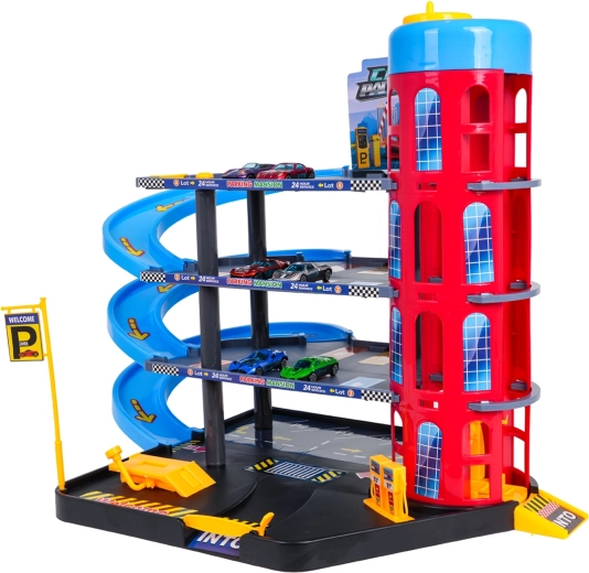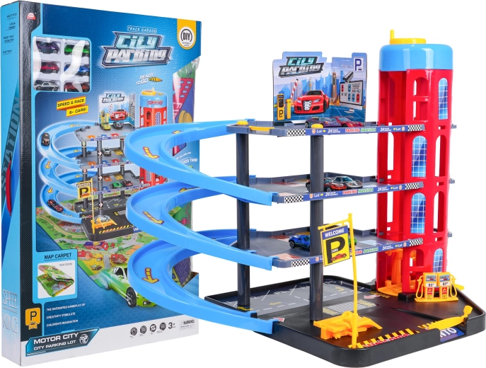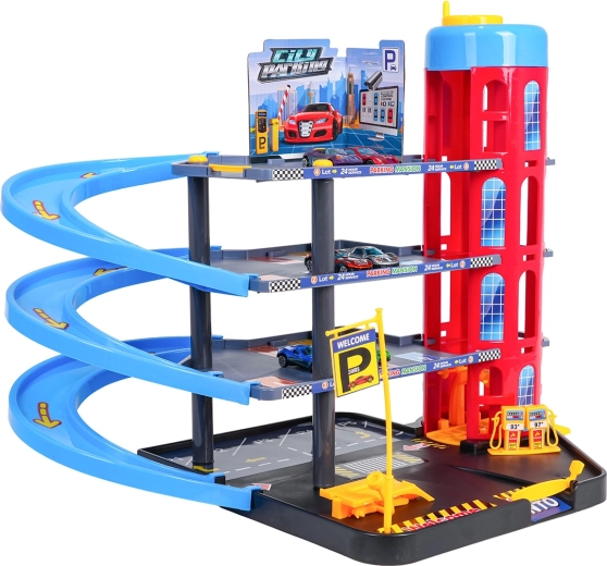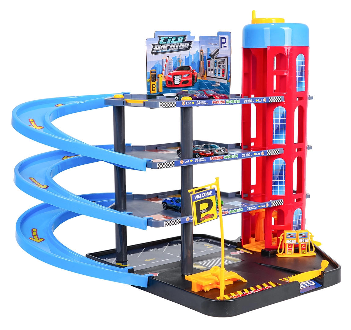Ez a színes, többszintes parkolóház a városi elemeket dinamikus vezetéssel ötvözi. A gyerekek a kézzel működtetett lifttel felvihetik az autókat, a különböző szinteken parkolhatnak, majd leengedhetik őket a spirálrámpákon. A beépített benzinkút, szervizemelő és sorompós bejárat támogatja a fantáziadús játékot.