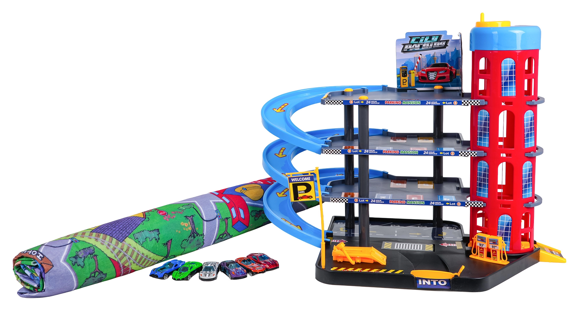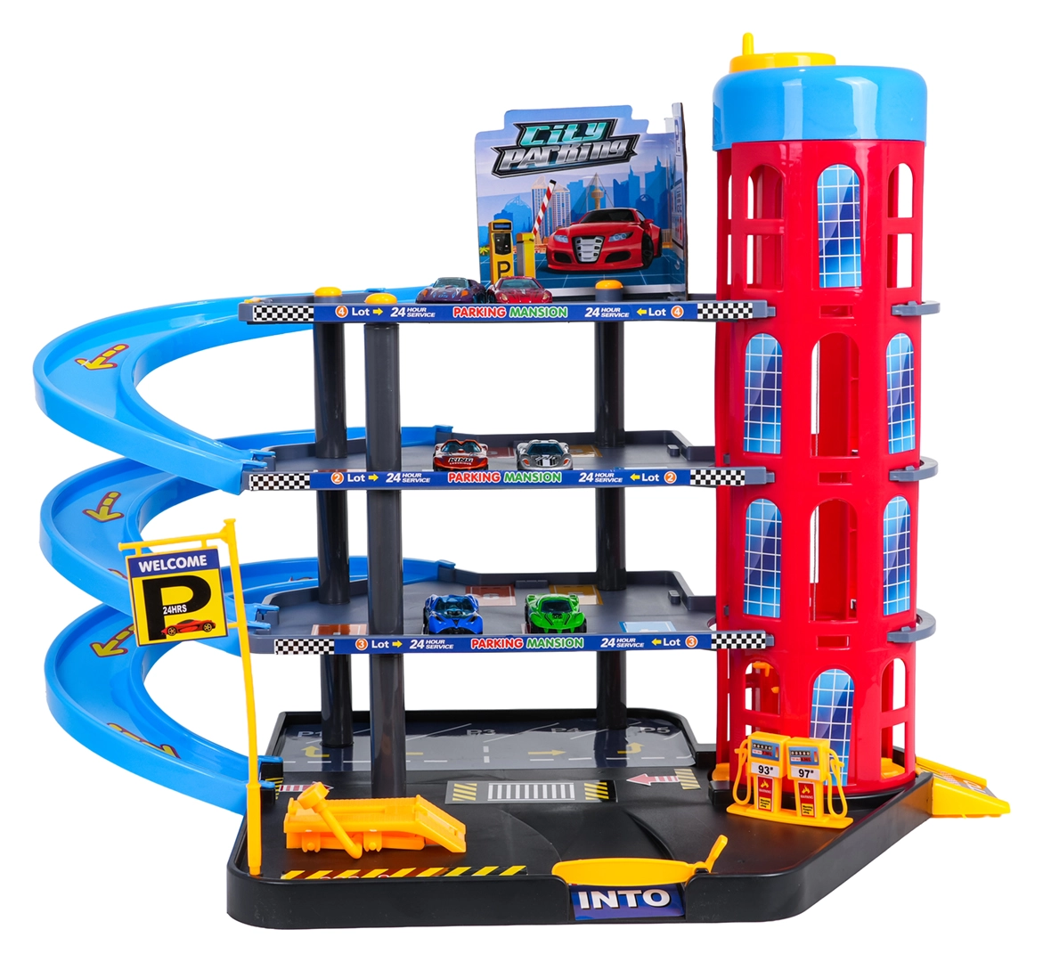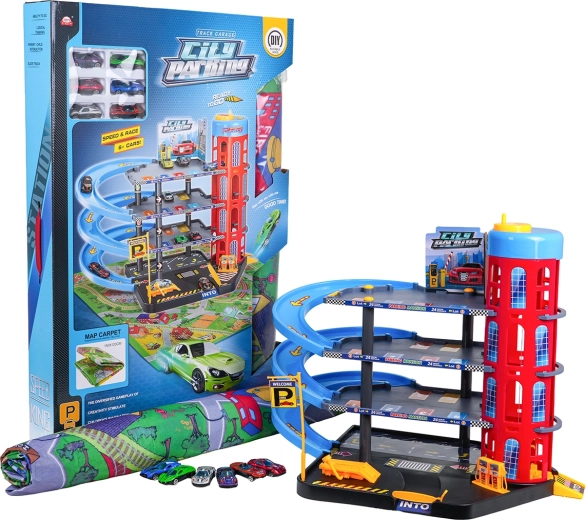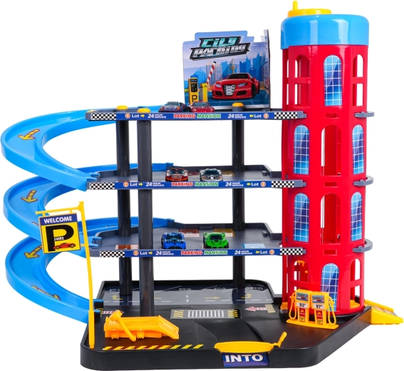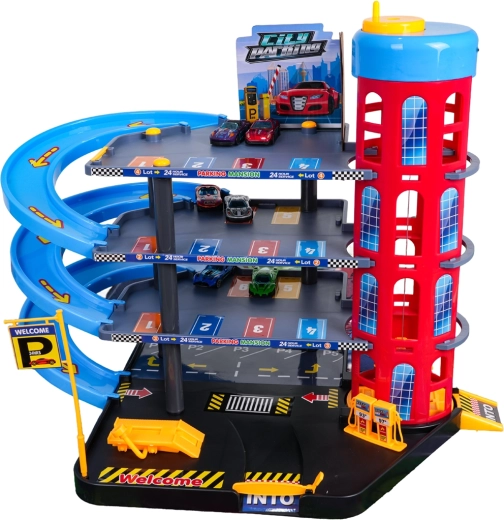 Ez a színes, többszintes parkolóház a városi elemeket dinamikus vezetéssel ötvözi. A gyerekek a kézzel működtetett lifttel felvihetik az autókat, a különböző szinteken parkolhatnak, majd leengedhetik őket a spirálrámpákon. A beépített benzinkút, szervizemelő és sorompós bejárat támogatja a fantáziadús játékot.