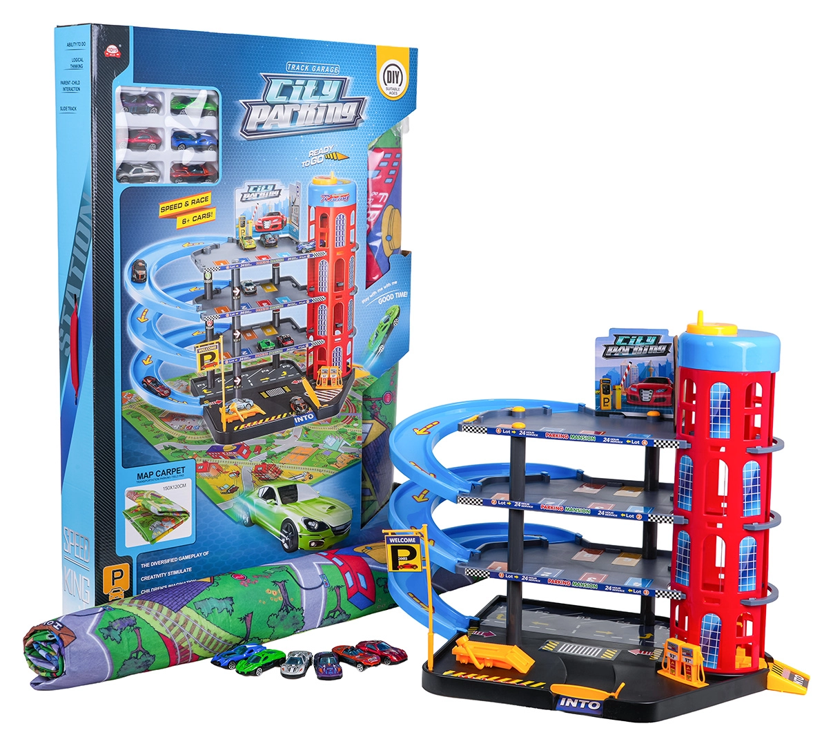 A csomag tartalmaz egy nagy filc szőnyeget utcákkal, amely bővíti a játéktér méretét, valamint 6 masszív, fém karosszériás kisautót az azonnali versenyzéshez. A tartós kialakítás és az átgondolt részletek ideális szetté teszik a parkolóházat a mindennapos játékhoz.