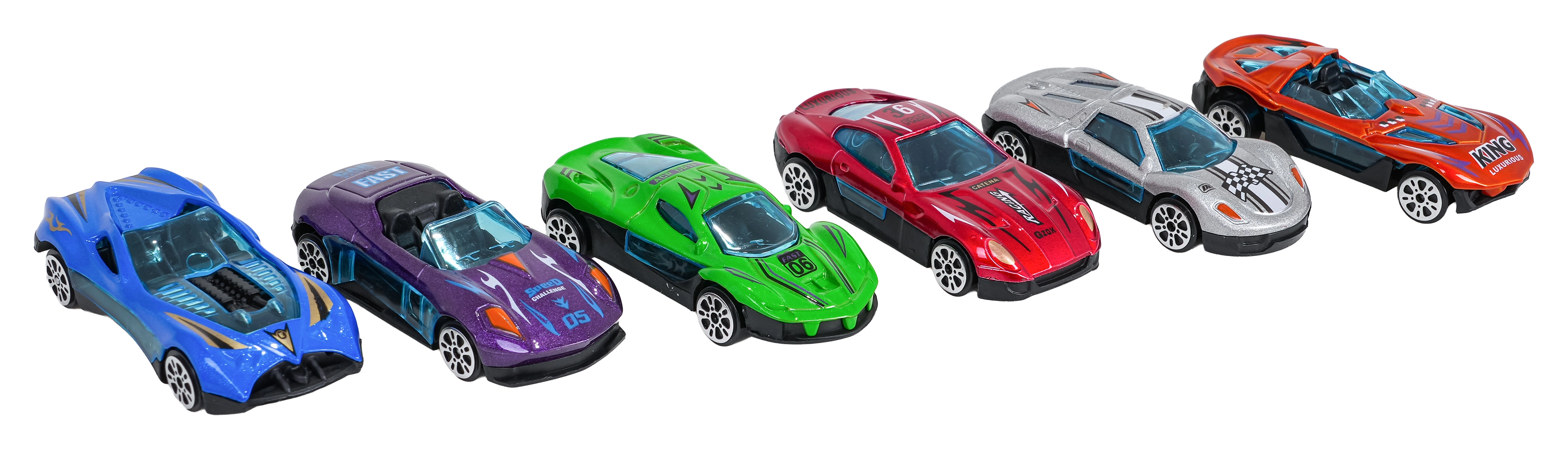 Azonnal játékra kész: hat strapabíró autó fém karosszériával, simán futó kerekekkel és sportos mintákkal a végtelen versenyekhez.