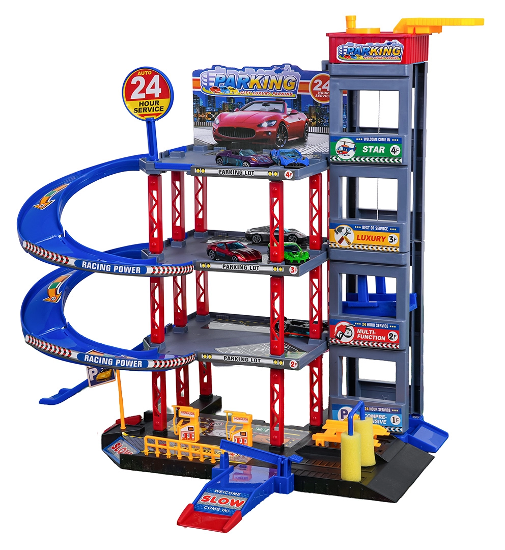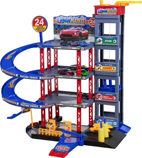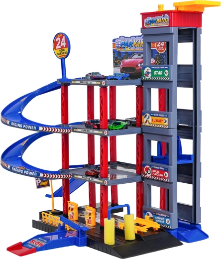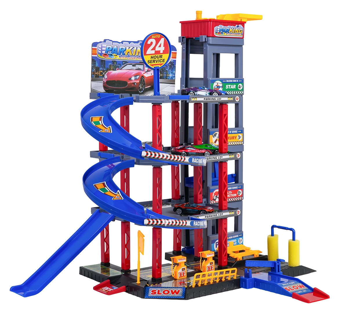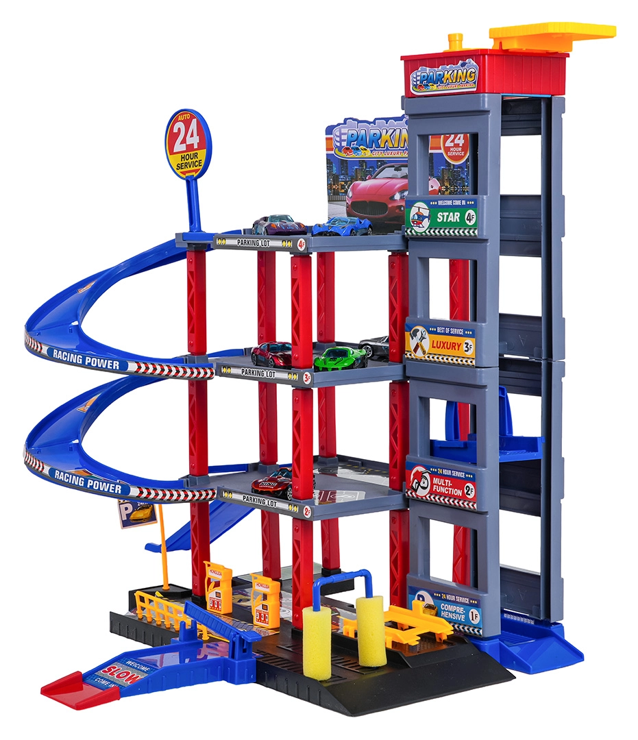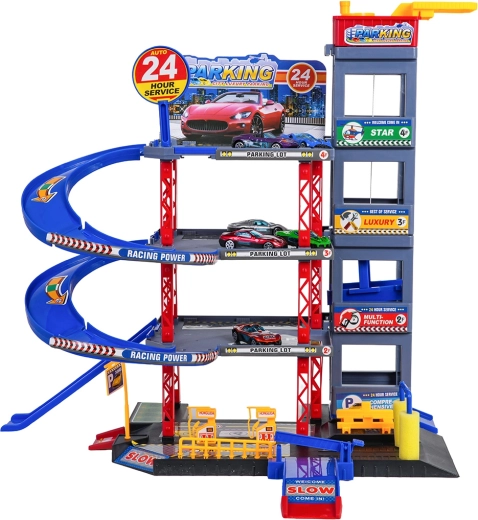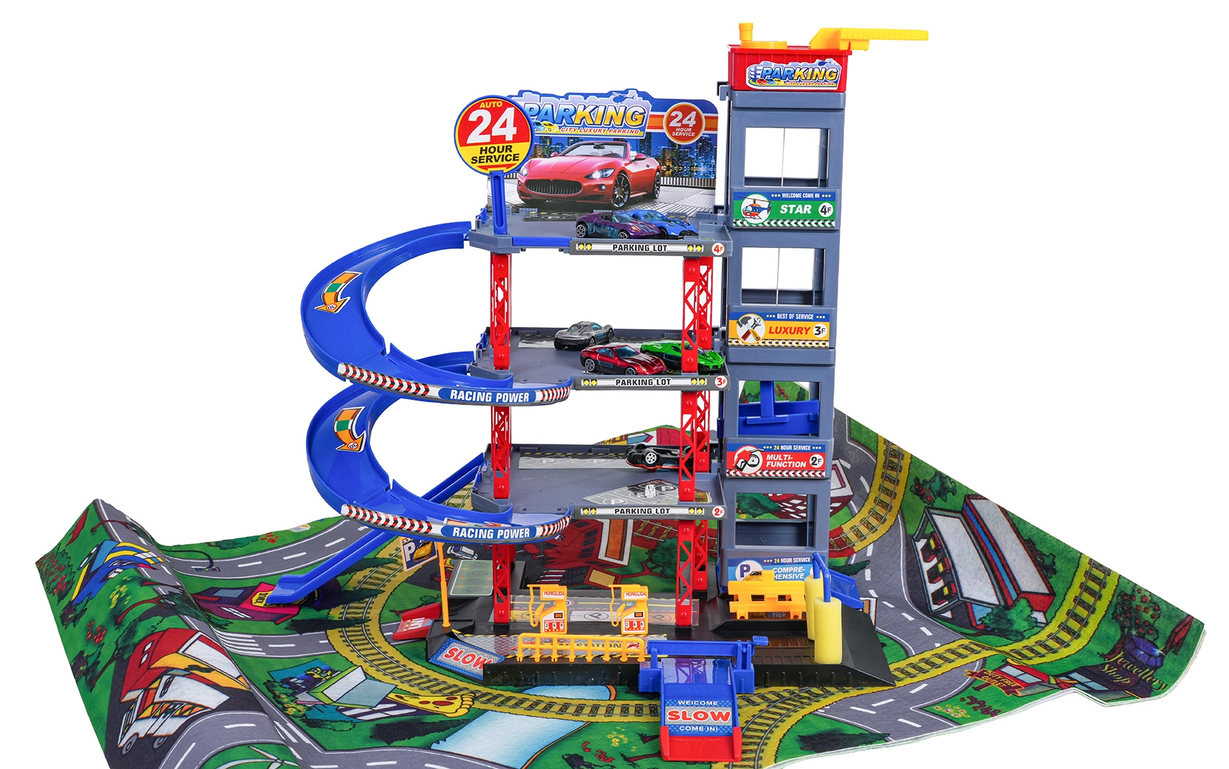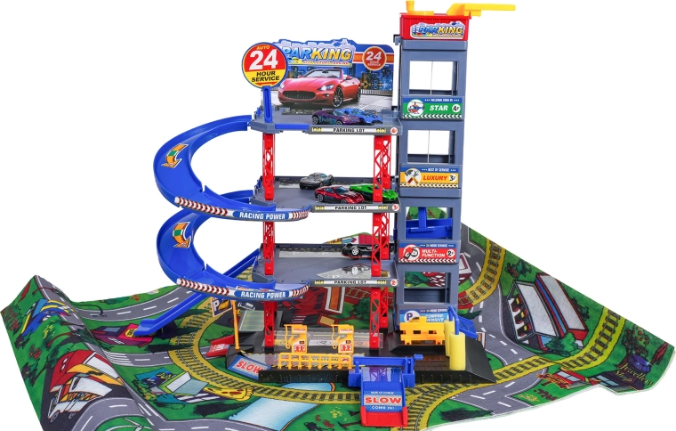 Ez a nagy, interaktív parkoló több szintet kínál, amelyeket gyors rámpák és kézi, tekerőkarral működő lift köt össze. A gyerekek felemelhetik a kisautókat a felső szintekre, kijelölt helyeken parkolhatnak, majd visszaereszthetik őket. Az utcákkal nyomtatott játékszőnyeg kibővíti a játék világát és segít valósághű közlekedési jeleneteket alkotni.
