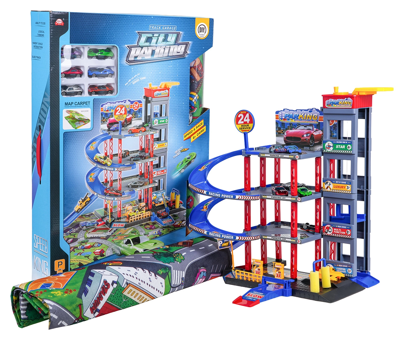 Fedezd fel a szórakozást a kis sofőröknek: masszív, többszintes parkoló kézi lifttel, spirál rámpákkal és nagy, utakkal nyomtatott játékszőnyeggel. A csomag része 6 fém kisautó, benzinkút, autómosó, földalatti szerviz emelővel és versenylejtők az akciódús játékhoz és a finommotorika fejlesztéséhez.