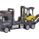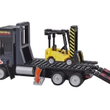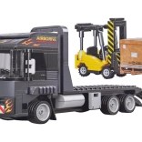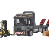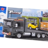 A síkplatós, lehajtható rámpákkal felszerelt vontató lehetővé teszi a targonca felrakodását és szállítását – pont, ahogyan a valóságban.