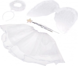 Változtassa gyermekét bájos angyallá ezzel a teljes készlettel. A szett tartalmaz fehér tollas szárnyakat, puha glóriát fejpánton, pelyhes tüllszoknyát rugalmas derékrésszel és csillag alakú varázspálcát. Könnyű, kényelmes, és ideális fellépésekre, előadásokra, farsangra, fotózásokra és otthoni játékra.