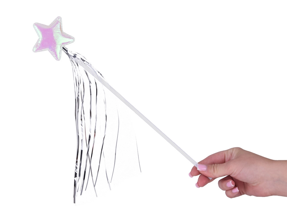 A puha, pelyhes glória fejpánton teszi teljessé az égi megjelenést. A csillogó csillaggal és ezüstös rojtokkal díszített pálca támogatja a fantáziadús játékot és fellépéseket.