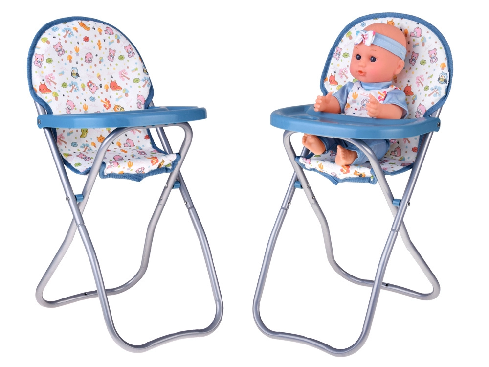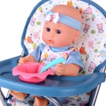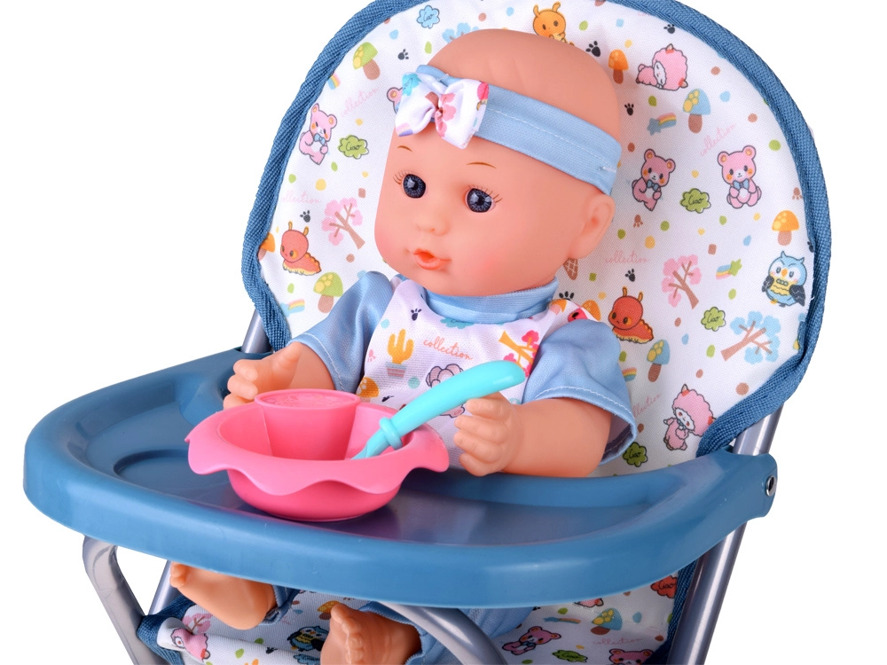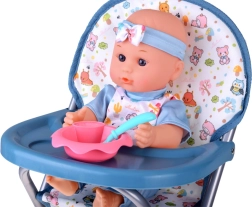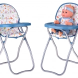 Stabil, kihajtható etetőszék tálcával és hellyel a tál számára evőeszközökkel. Támogatja a valósághű etetési és asztali szerepjátékot a babával.