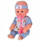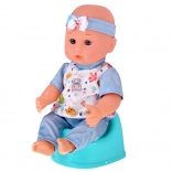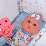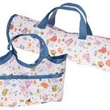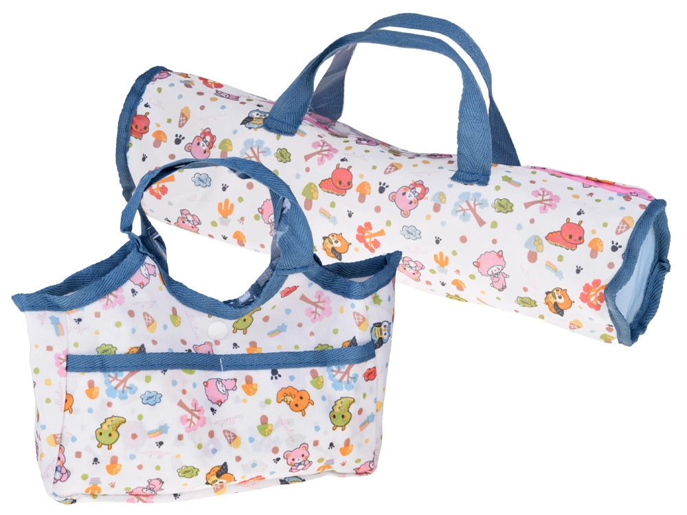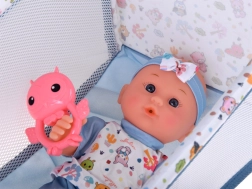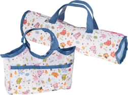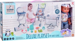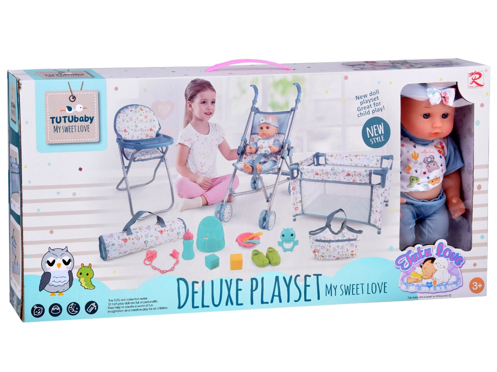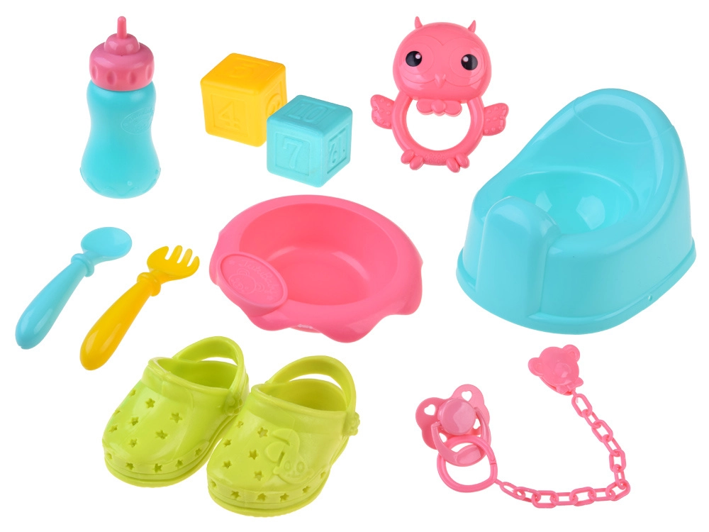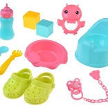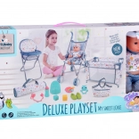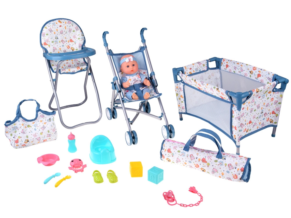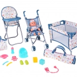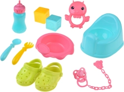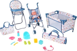 A praktikus felszerelés tartalmaz étkezőkészletet (tál, evőeszközök és cumisüveg), bilit, láncos cumit, színes kockákat és csörgőt. A légáteresztő hálós oldalakkal ellátott utazóágy és a táska ideális játékhoz és tároláshoz. A gazdag kiegészítőknek köszönhetően a gyerekek könnyen utánozzák a valódi babaápolást, fejlődik a kommunikációjuk és a finommotorikájuk.