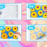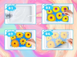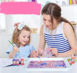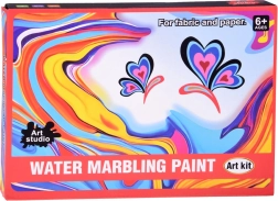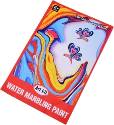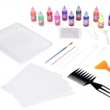A csomagban mindent megtalál: 12 db 16 ml-es festéküveget precíz csúccsal, műanyag tálcát, papírokat és egy eszközkészletet (cseppentők, fésű, ecset, spatula stb.). A por vízzel való elkeverésével zselés fürdőt hoz létre, ebbe cseppenti a festékeket és kialakítja a mintát – ezt ezután egyszerűen rányomtatja a papírra.