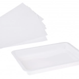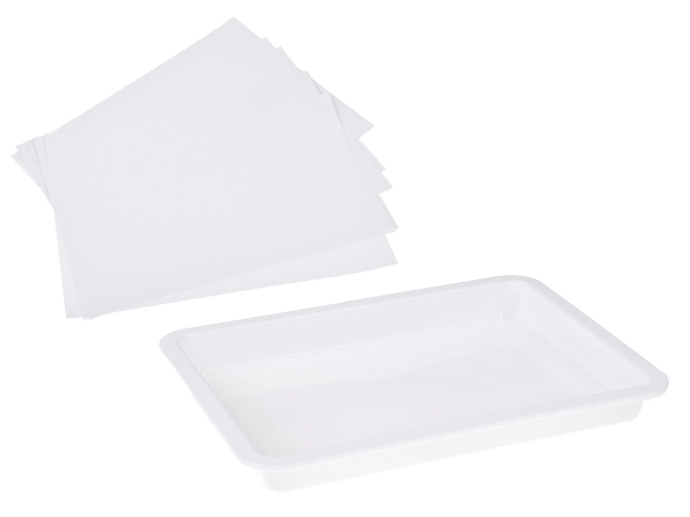 Tálca, papírok, festékek, cseppentők, fésű, ecset és spatula – vagyis minden, amire az első márványozott képhez szüksége van.
