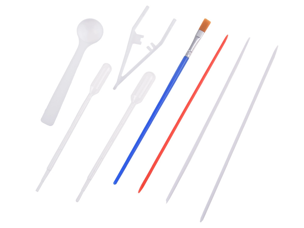 2 pipetta/cseppentő, kanál, csipesz, fésű, ecset, spatula, rajztűk
