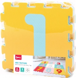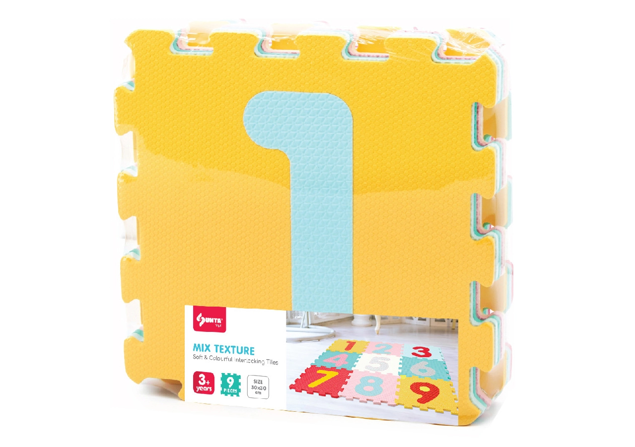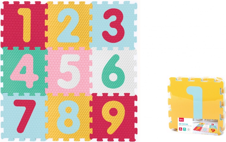 Praktikus készlet puha habszivacs blokkokból kivehető számokkal a biztonságos játékhoz és tanuláshoz. Kilenc darab, 32 × 32 cm méretű elem alkot puha alátétet, amely tompítja az ütéseket, hőszigetel, és fejleszti a finommotorikát valamint a számfelismerést.