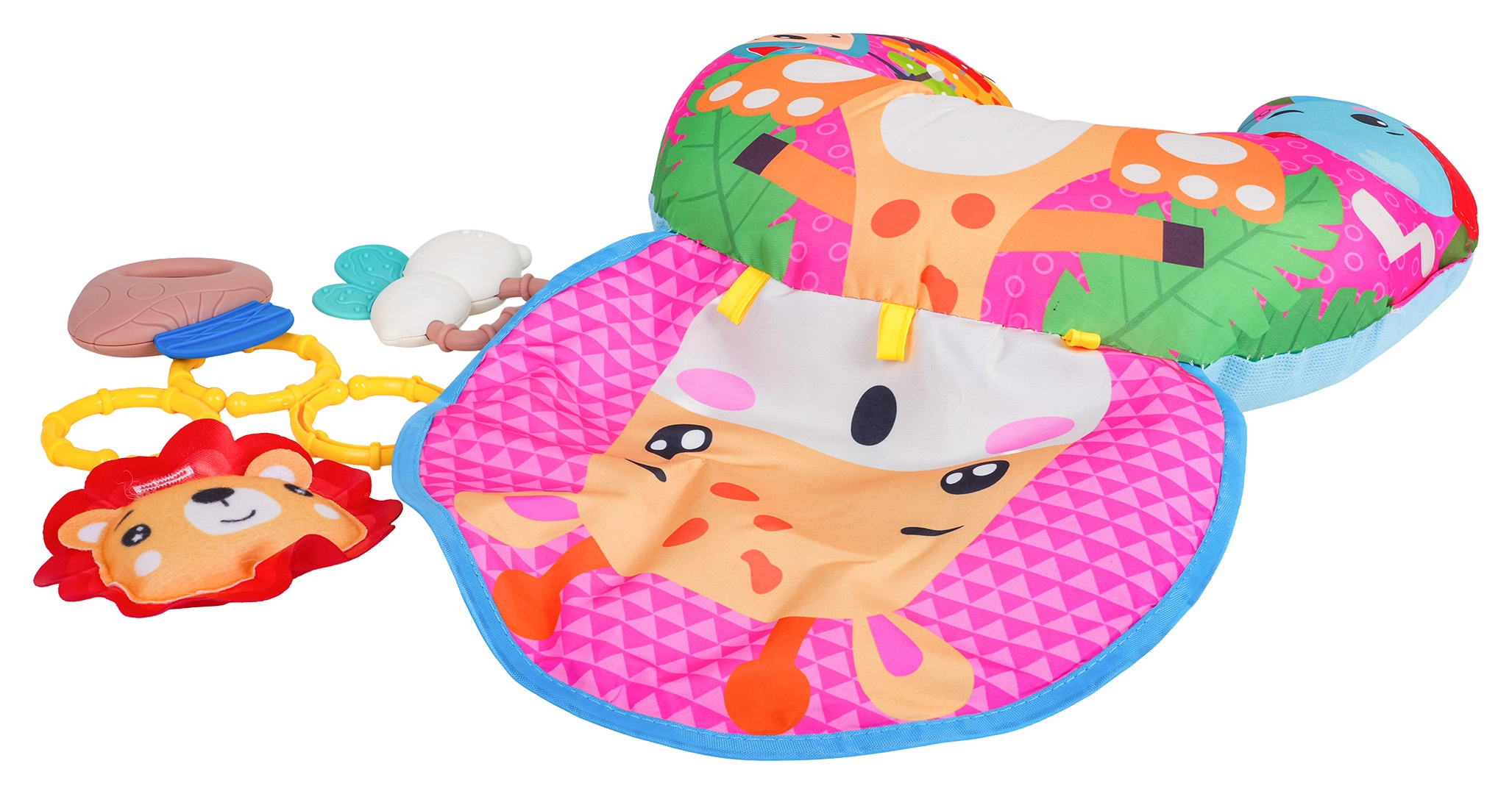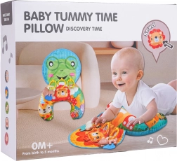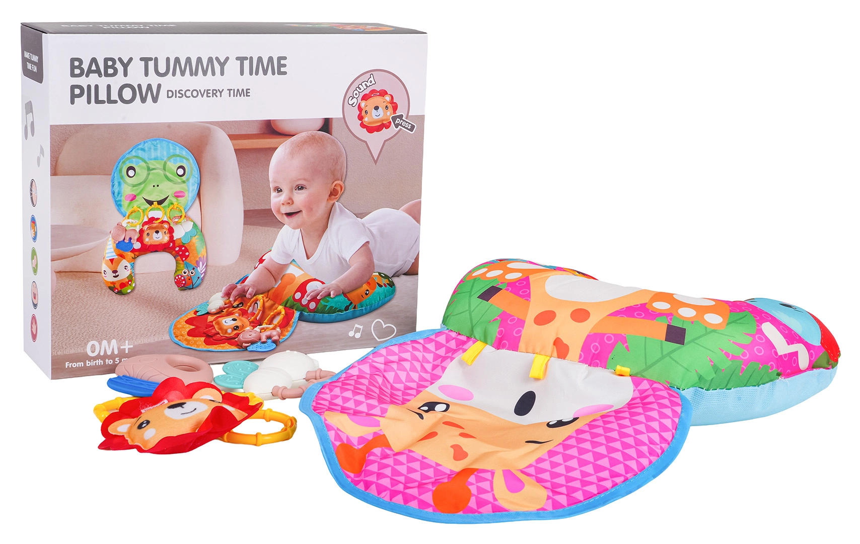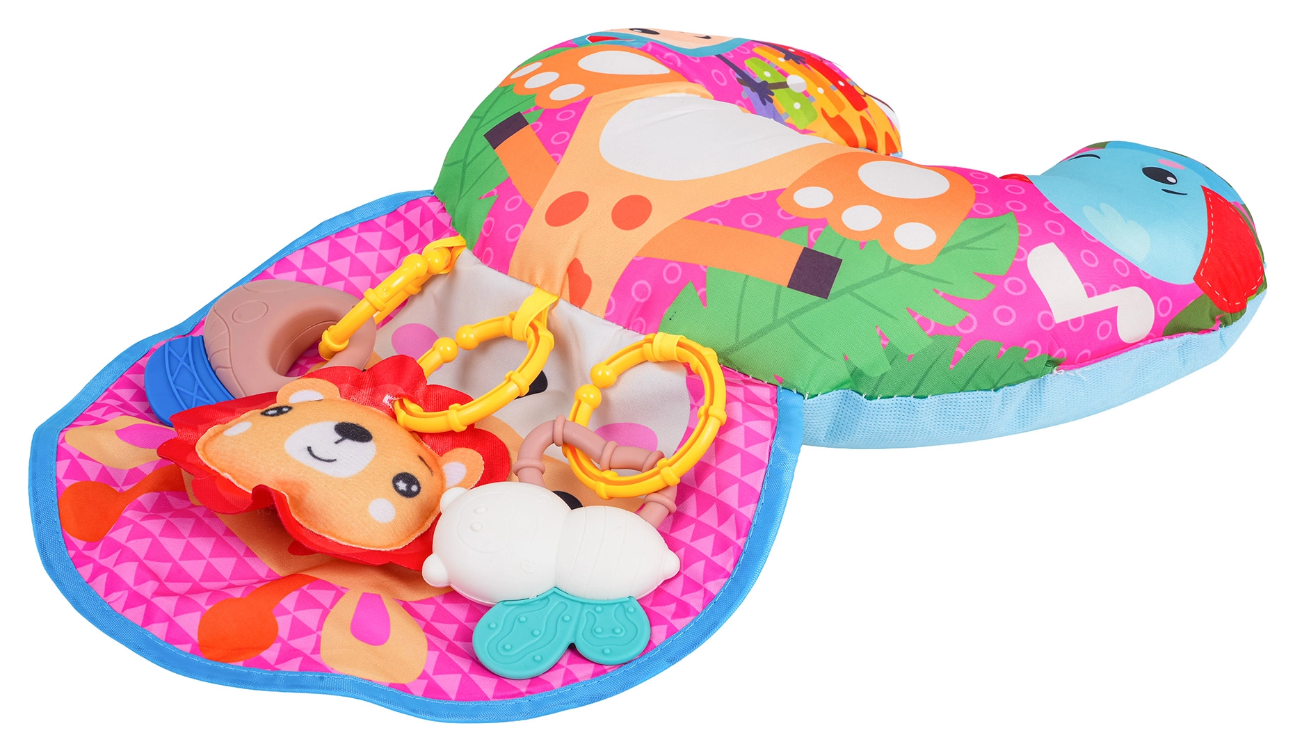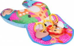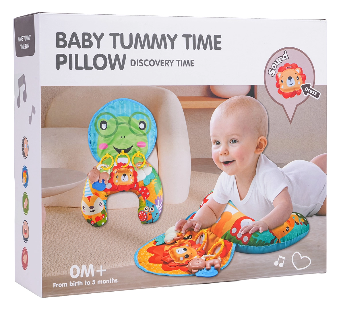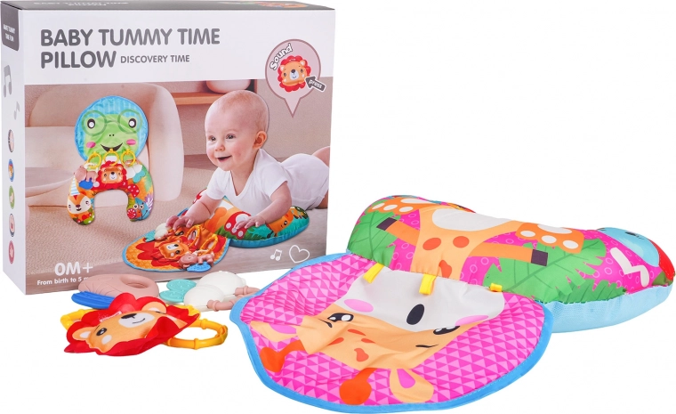 Puha, színes, U alakú baba párna zsiráf motívummal, amely támogatja a babát hason fekve és ülés közben is. A csomag tartalmaz levehető függő játékokat rágókákkal, csörgővel és sípocskával, amelyek fejlesztik az érzékelést és a finommotorikát. Alkalmas már az első napoktól, biztonságos anyagokból készült.