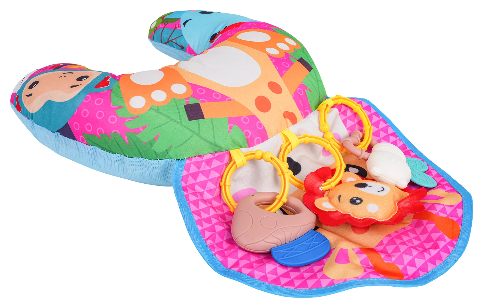 Szenzoros baba U alakú párna zsiráffal és játékokkal