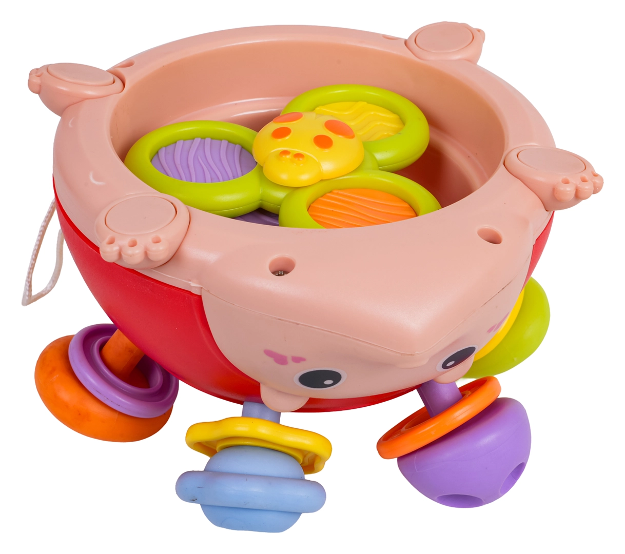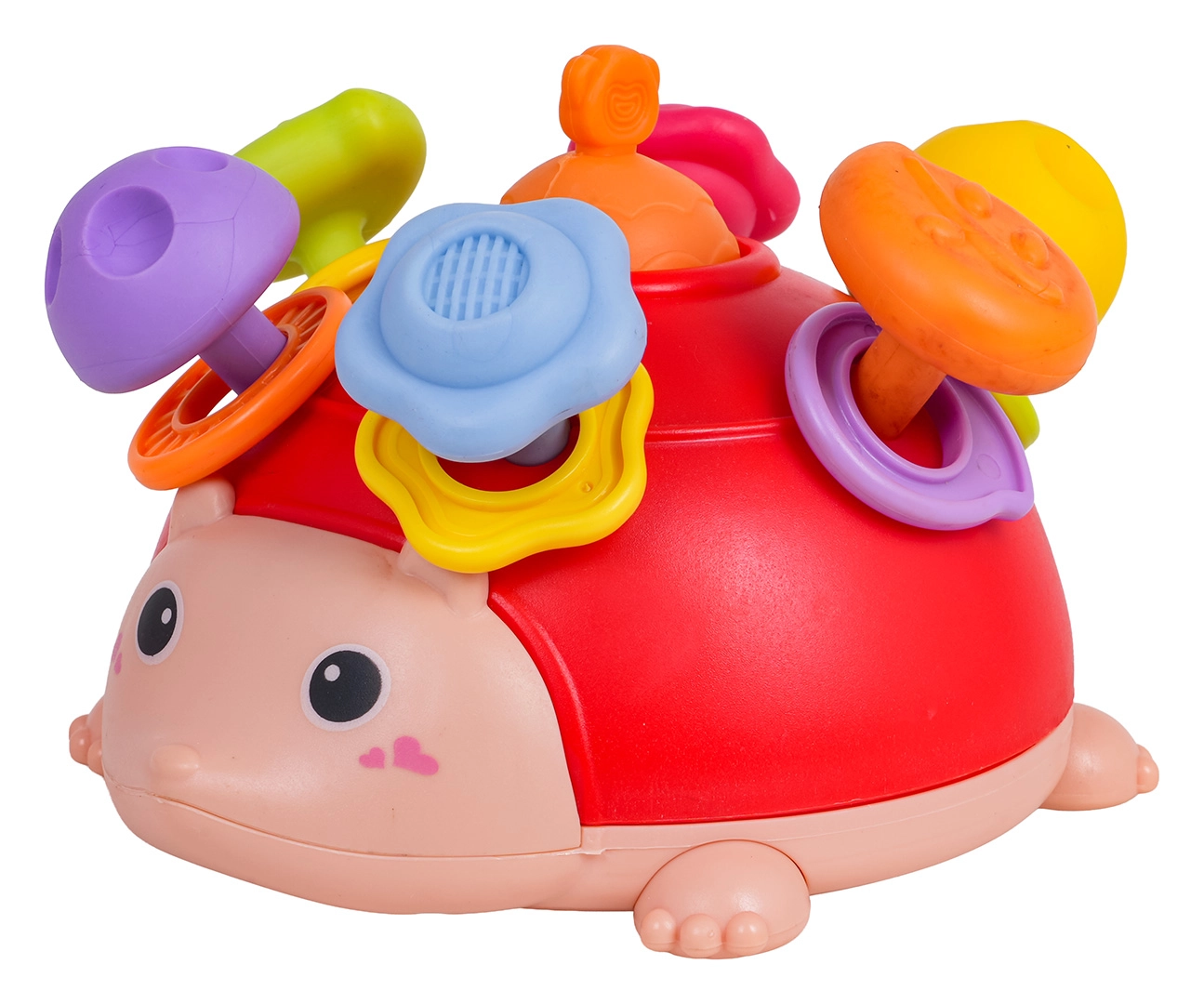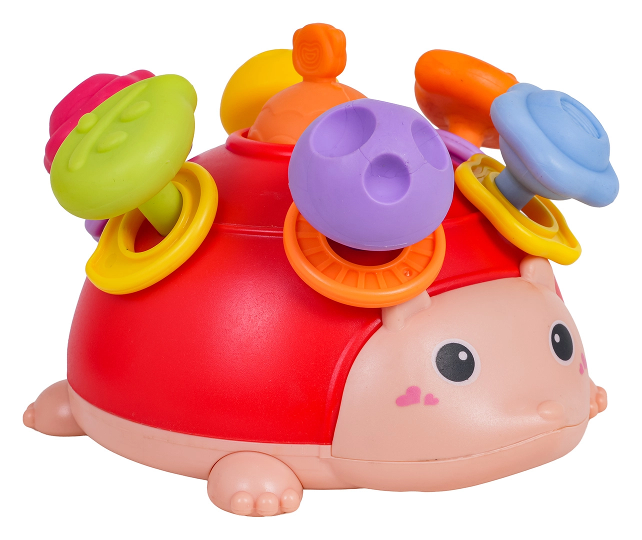 A tüskék alatt színes karikák rejtőznek, amelyek rázásra csörögnek. A gyerekek levehetik, újra feltehetik, és gyakorolhatják a szem–kéz koordinációt.
