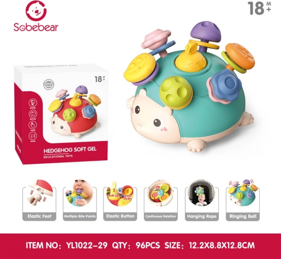 A bájos sün 18 hónapos kortól kínál multifunkciós szenzoros stimulációt és rengeteg játéklehetőséget. Biztonságos, éles élektől mentes anyagokból készült, élénk színekkel és különböző felfedezhető textúrákkal. A puha tüskék megkönnyebbülést hoznak a fogzás időszakában, alattuk színes, csörgő karikák rejtőznek. A sün rendelkezik forgó spinnerrel, rugalmas karokkal és lábakkal, és a felakasztható zsinórnak köszönhetően könnyen rögzíthető például a kiságyhoz.