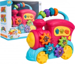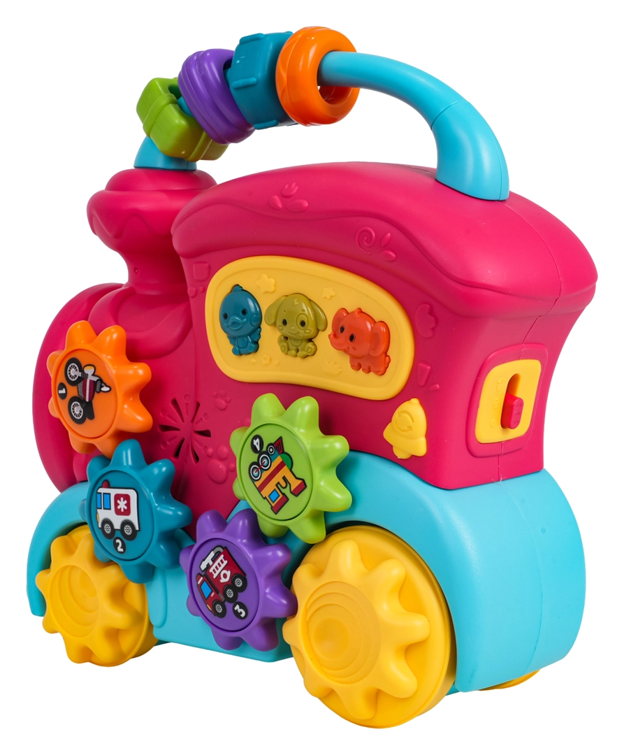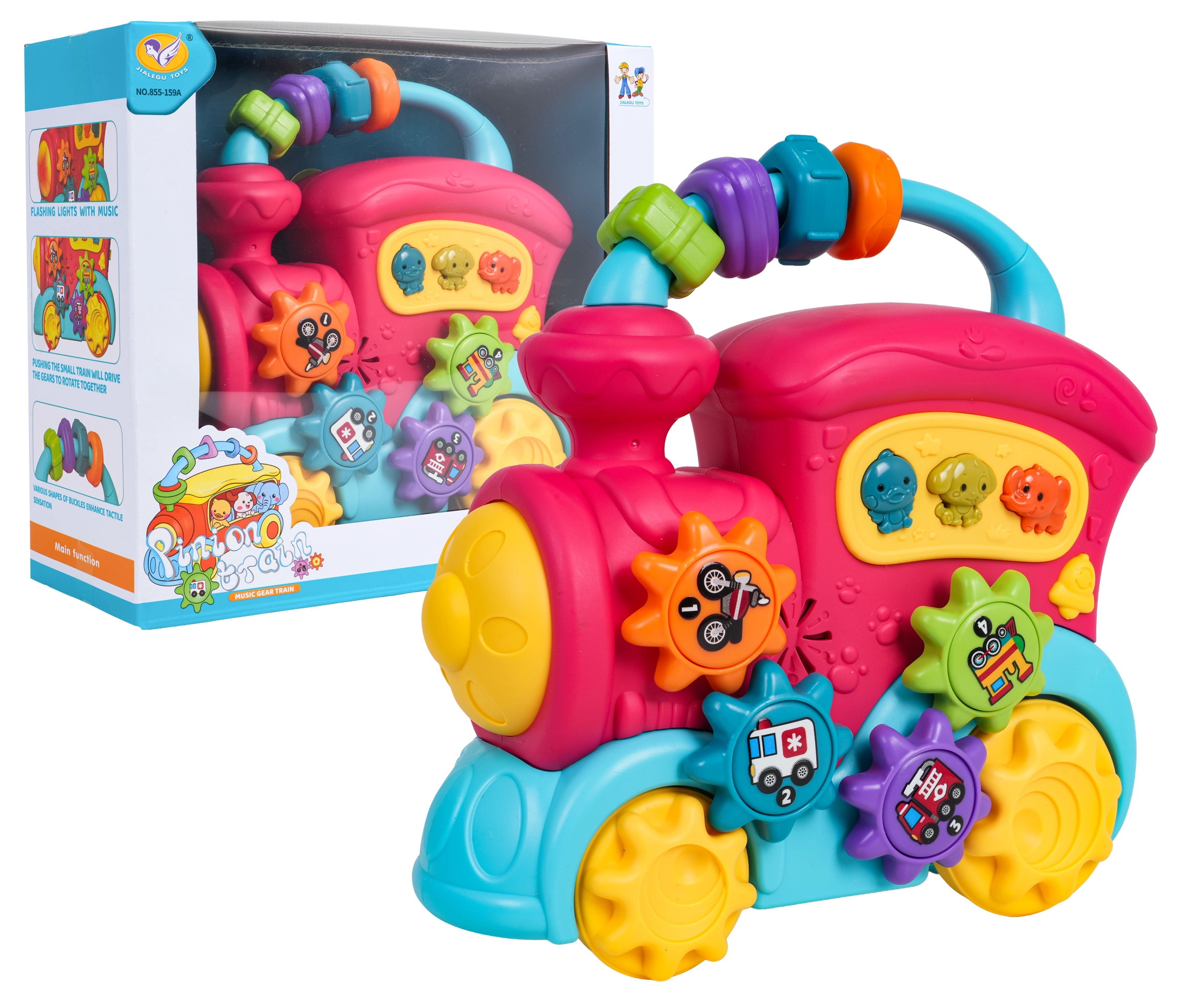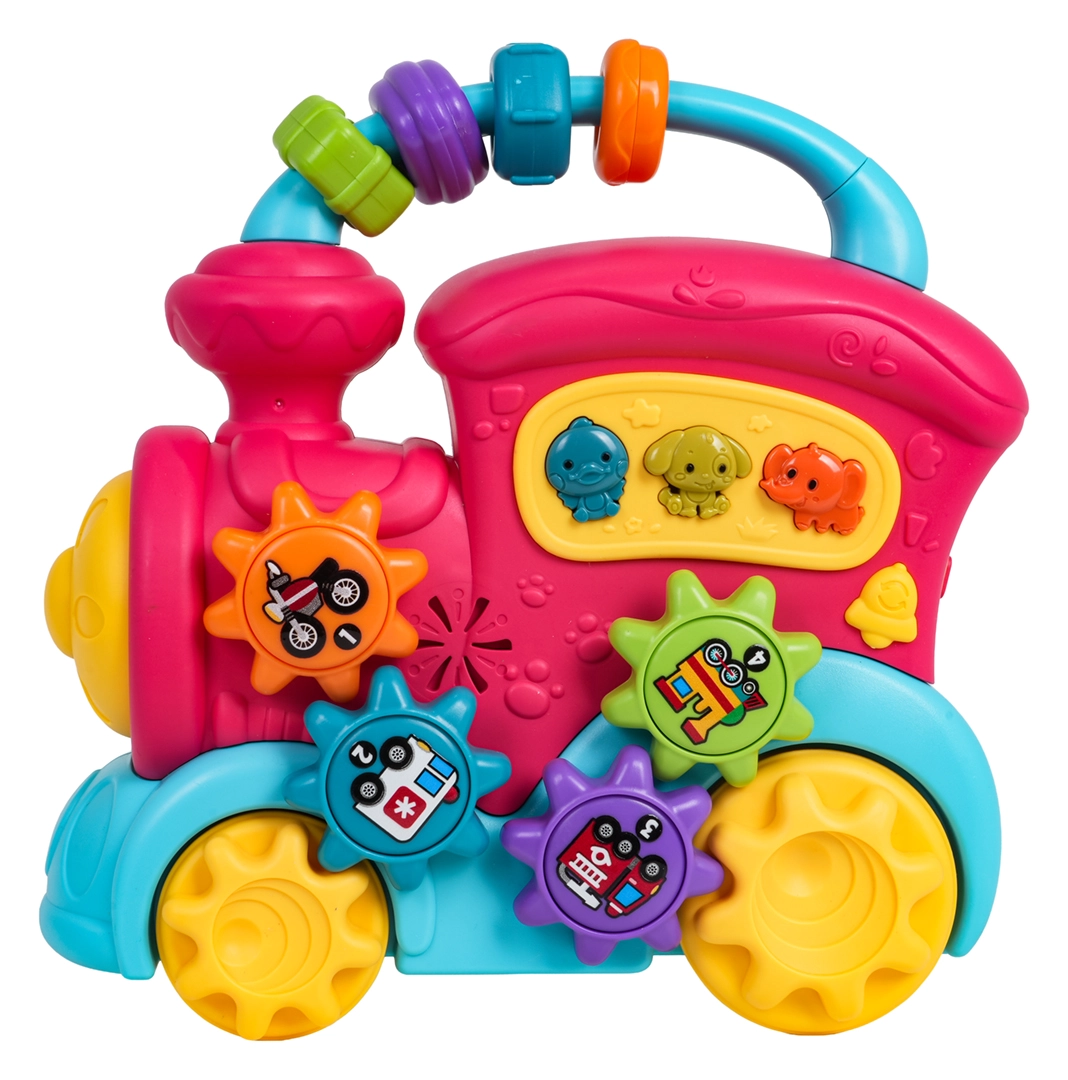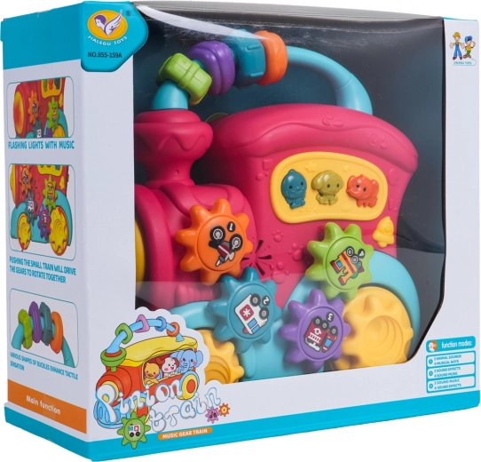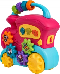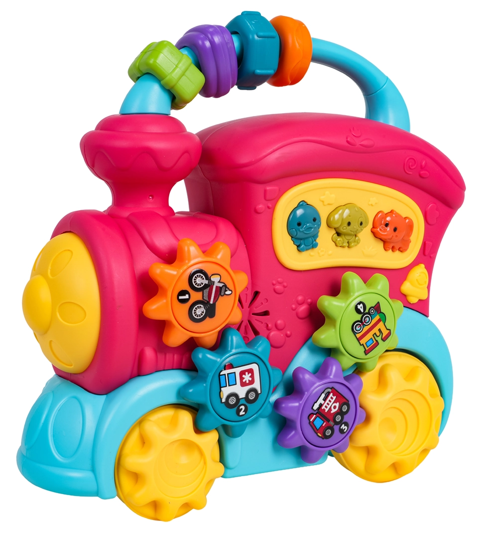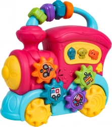 Ez a színes, minőségi műanyagból készült kisvonat számos interaktív elemmel nyűgözi le a kis felfedezőket. A tetőn szenzoros gyöngyök, az oldalon képes fogaskerekek és állatos gombok találhatók, amelyek megnyomásakor kacsa-, kutya- vagy elefánthangok, vidám csengők és dallamok szólalnak meg. A vonat tologatásakor a kerekek és a fogaskerék-mechanizmus megforognak és kellemes csörgő hangot adnak, az első fényszóró felgyullad, így a gyermek további felfedezésre ösztönözve van.