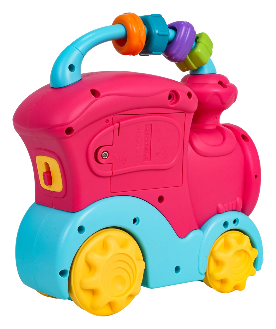 A játék biztonságos használatra készült 12 hónapos kortól, kétfokozatú hangerőszabályozással rendelkezik, és élénk színeivel támogatja a vizuális észlelést. Az ergonomikus fogantyú megkönnyíti a hordozást és a padlón való tologatást. A vonatot 3× AA 1,5 V elem működteti (nem tartozék).