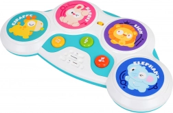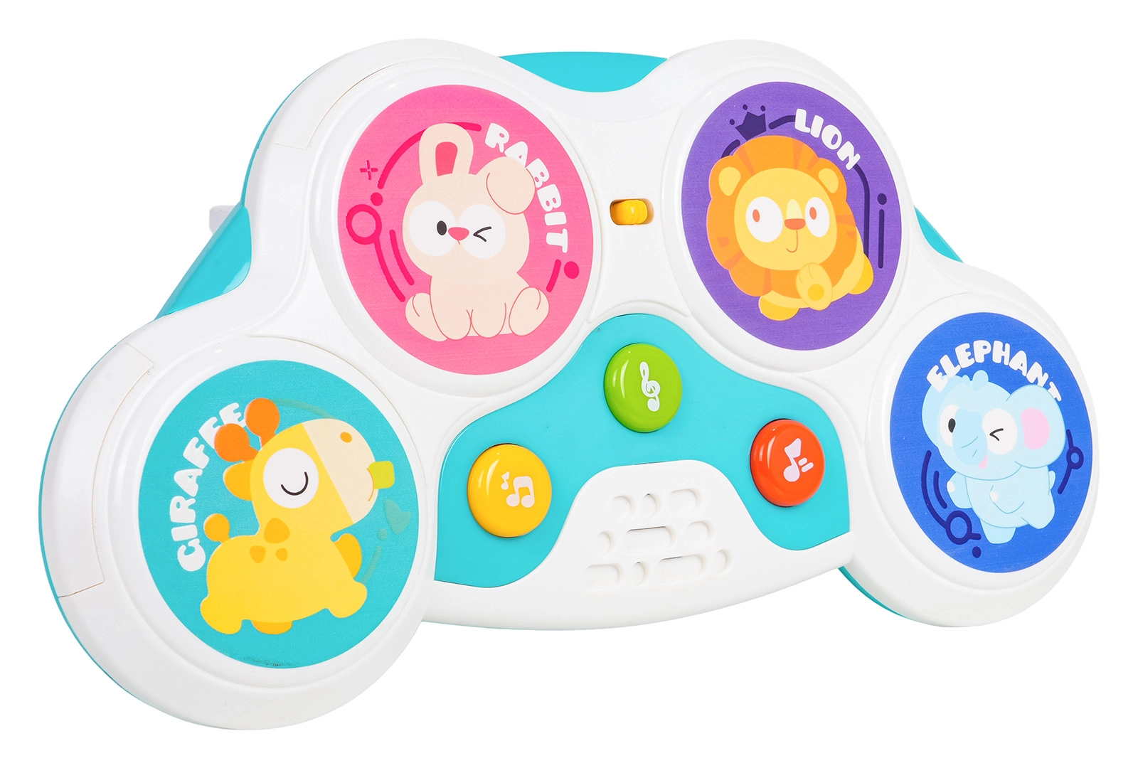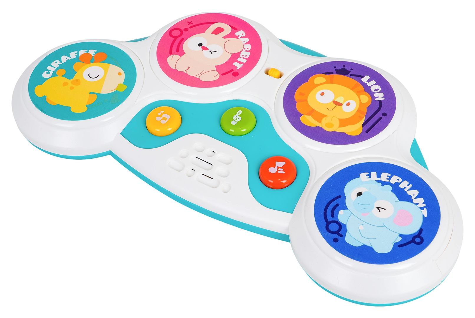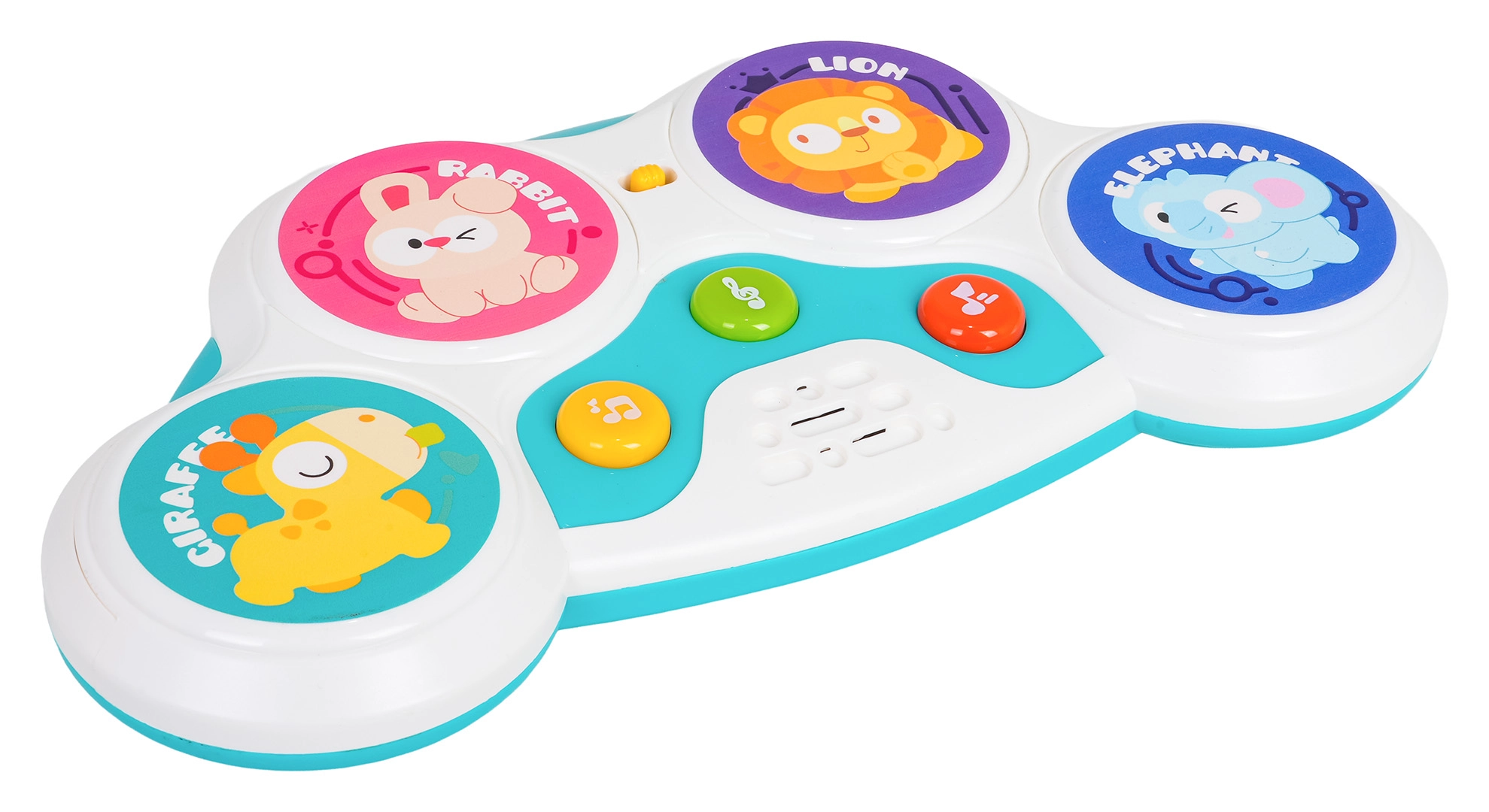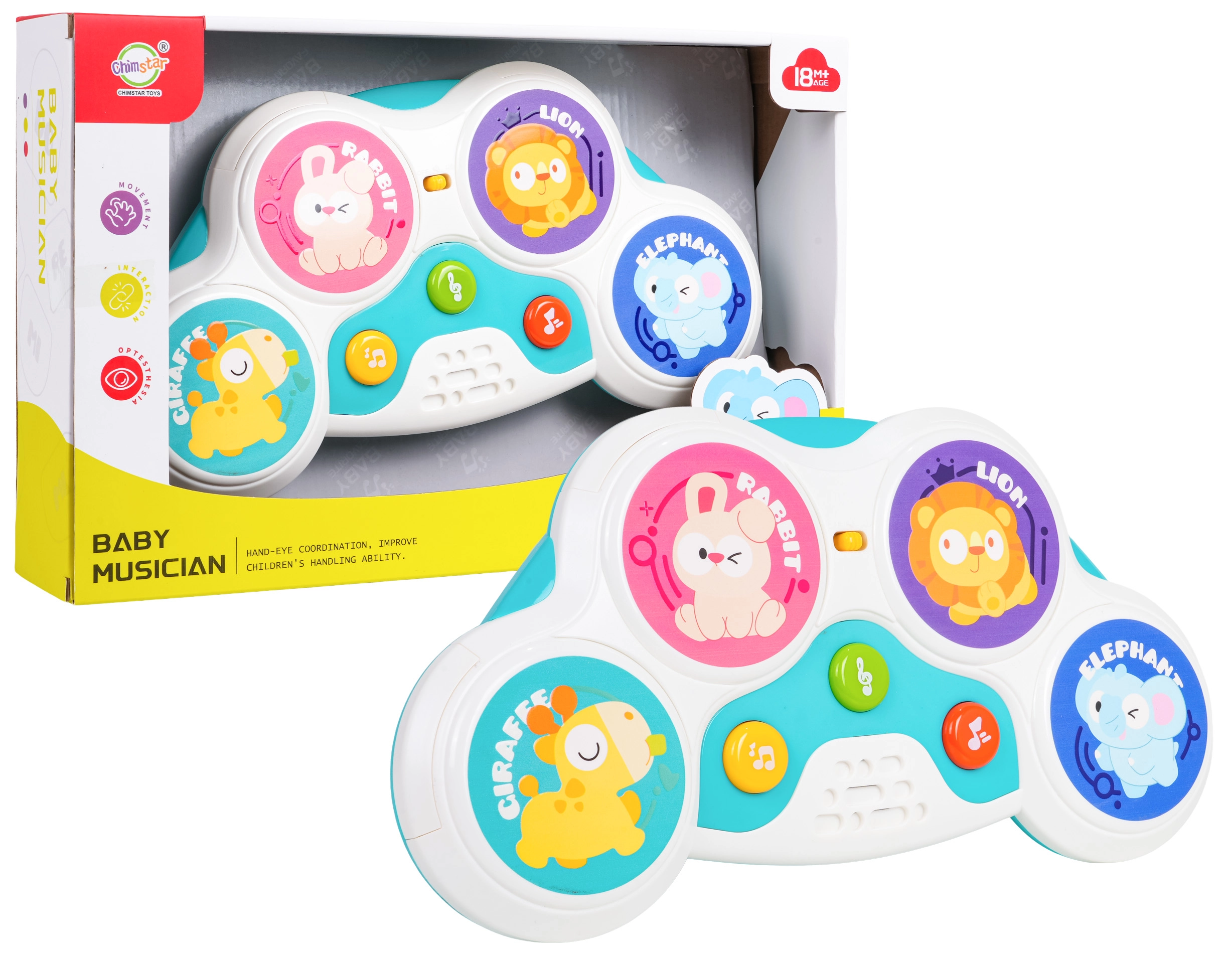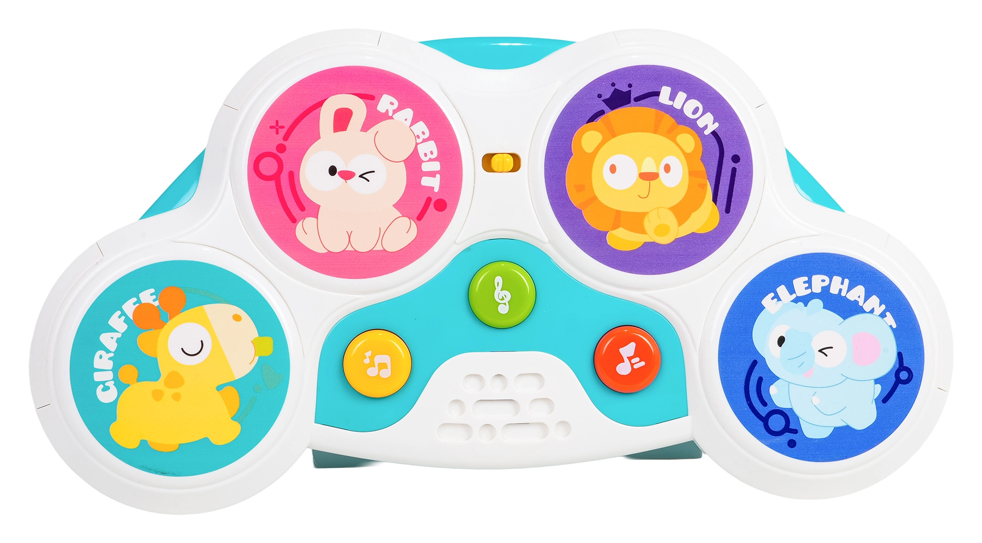 Négy színes felület nyuszival, oroszlánnal, zsiráffal és elefánttal állathangokat, dallamokat és dobritmusokat indít – móka egyetlen érintésre.