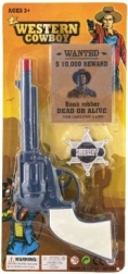 Válj kis cowboyjá! Ez a műanyag revolver seriffjelvénnyel minden kis pisztolyhőst megörvendeztet. A fegyver csattogó hangot ad ki, a csomag része továbbá egy seriffjelvény és egy „Körözés alatt” plakát a még nagyobb szórakozásért. Ideális játék 3 éves kortól.
