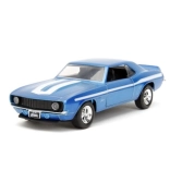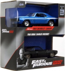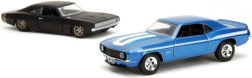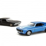 Ez a stílusos duopack két klasszikus muscle cart hoz gyűjtői minőségben: kék Chevrolet Camaro 1969 fehér csíkokkal és matt fekete Dodge Charger Wide Body 1968. Valósághű arányok, letiszult karosszériavonalak és átlátszó ablakok idézik a Halálos iramban széria filmszerű hangulatát.