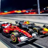 Építsd meg az ideális pályát 6,3 m hosszban, összeszerelt méret: 175 × 122 cm. A csomag mindent tartalmaz az azonnali induláshoz: két licencelt F1 autó (ORACLE RED BULL RACING RB21 „M. Verstappen, No.1” 2025 és FERRARI SF-25 „L. Hamilton, No.44” 2025), tápegység elem, mechanikus körszámláló és két vezérlő Turbo funkcióval.