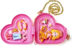 Stílusos, szívalakú táska lánccal, amely hordozható tárolóként szolgál a babának és a kiegészítőknek – tökéletes játékhoz bárhol.