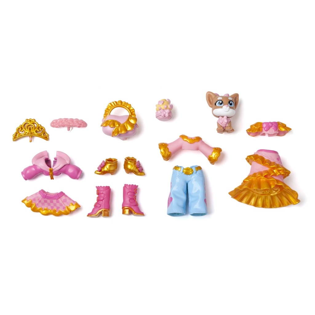 A KookyLoos Taylor – Golden Gala deluxe szett igazi álom a kis stylistoknak. Taylor imádja az édes és sikkes stílust, és készen áll bármilyen alkalomra: sétára a parkban a kiskutyájával, vásárlásra a barátnőkkel vagy az ünnepi Golden Gala estére. A három arckifejezést egyetlen kattintással váltva könnyedén igazíthatod az outfitet a hangulathoz és a sminkhez.