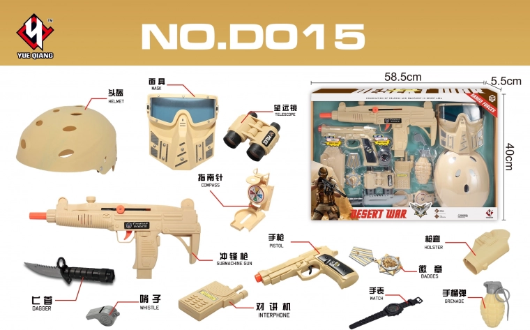 Ez a homokszínű katonai készlet minden kis kalandort lenyűgöz. A gyerekek valósághű kiegészítőkkel játszhatnak, amelyekkel úgy érezhetik magukat, mintha igazi küldetésen lennének – a sisaktól és mellénytől kezdve a kompon és adóvevőn át. A puska kézi működésű (a narancssárga gyűrű jobbra tolása és a ravasz meghúzása után lövés hangot ad), a pisztoly pedig 3× AG13 elemmel működik (az elemek a csomagban találhatók).