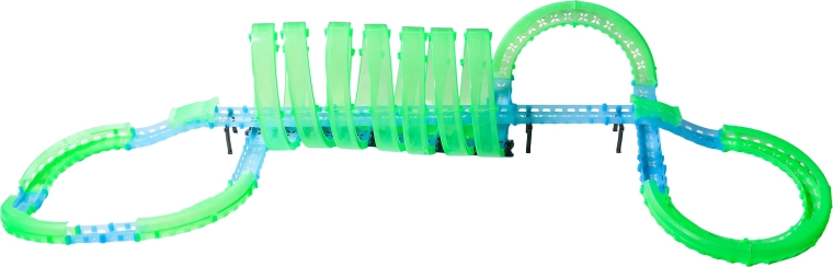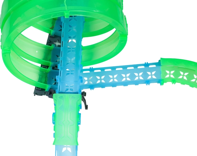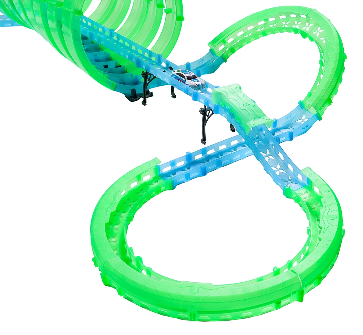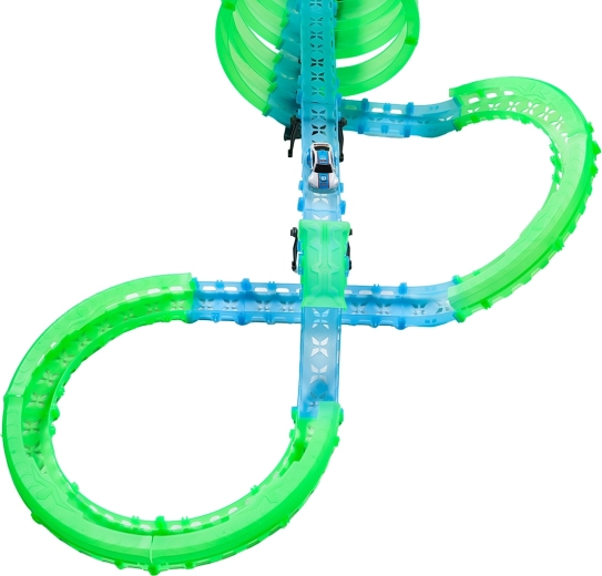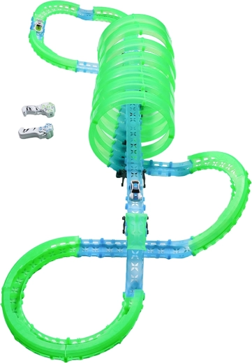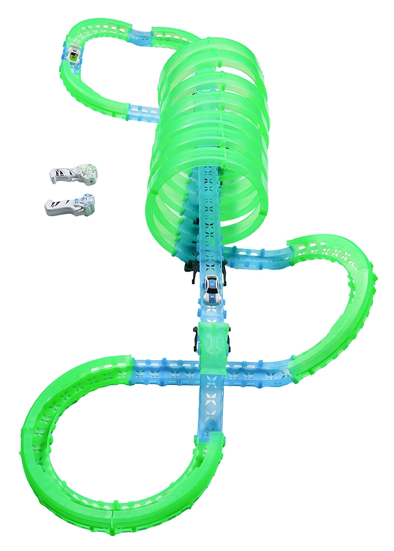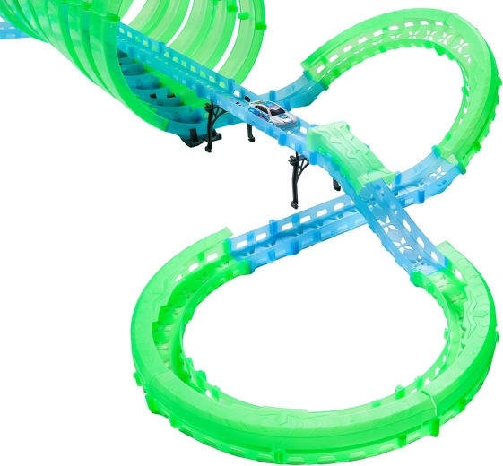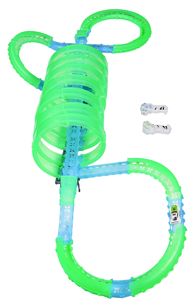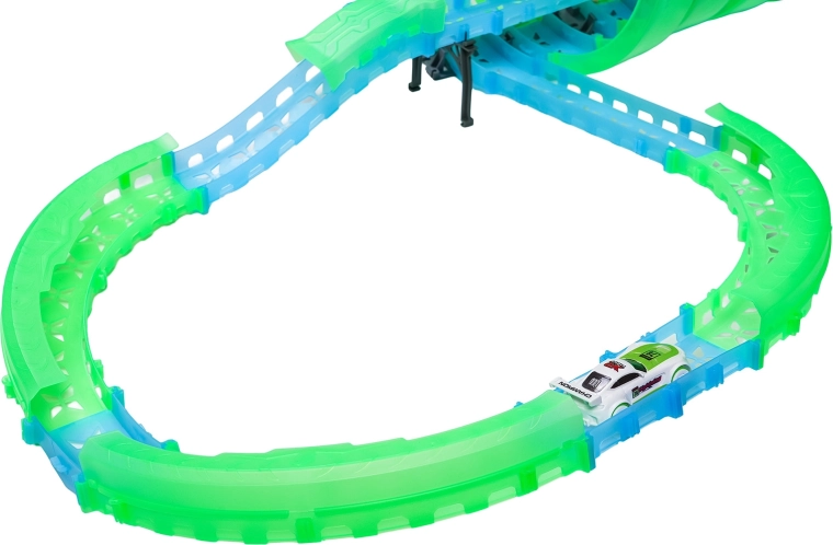 Ez a moduláris versenypálya fényvezető elemekből áll neonzöld és kék színben, könnyen összepattintható, és gyors átrendezést tesz lehetővé. A fluoreszkáló anyag megvilágítás után felragyog, és a LED-es kisautókkal együtt a szobát magával ragadó fényarénává változtatja.