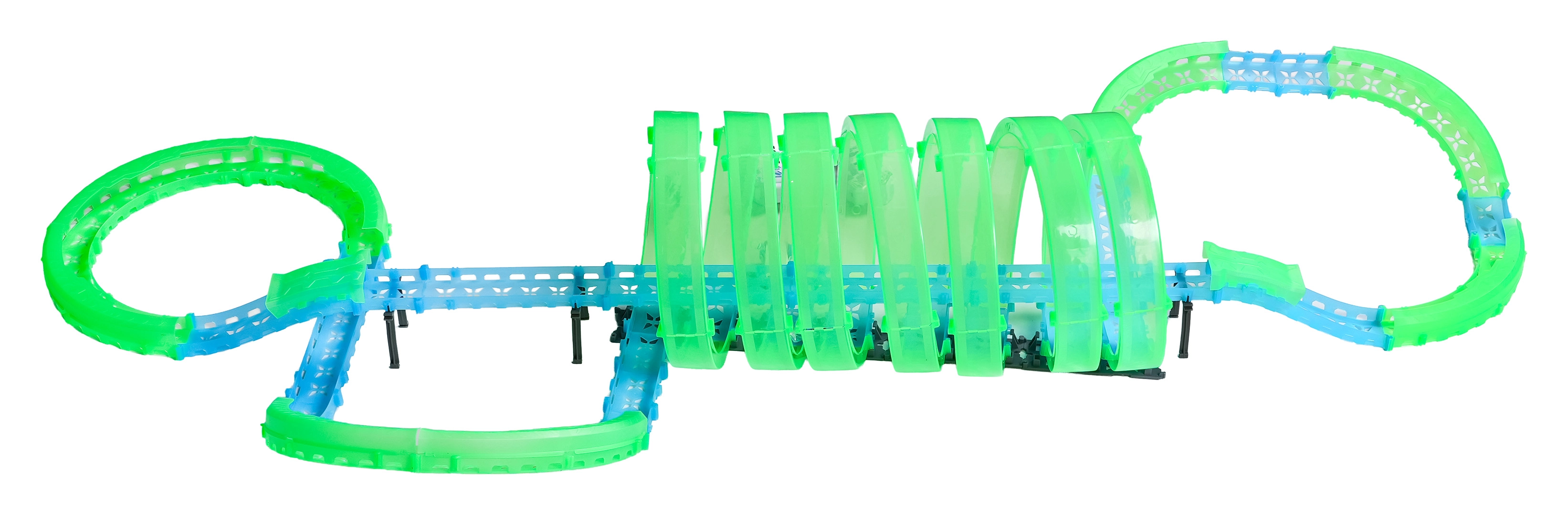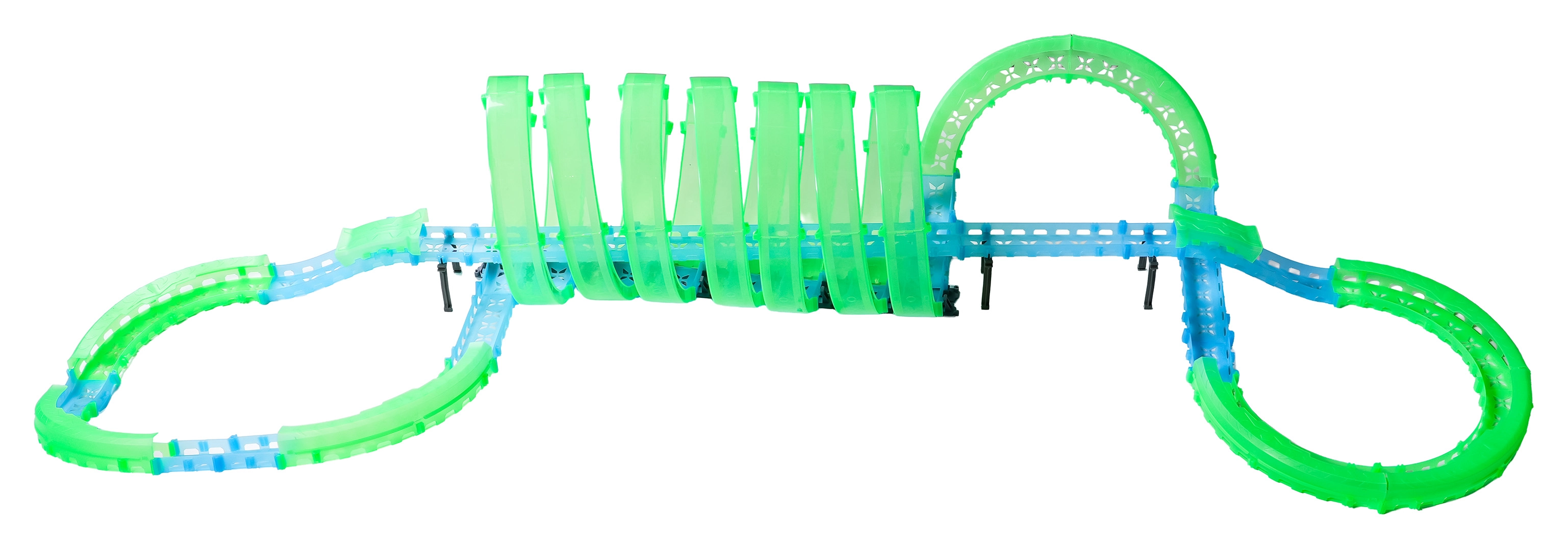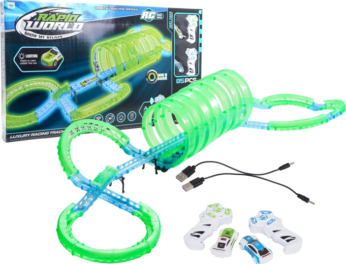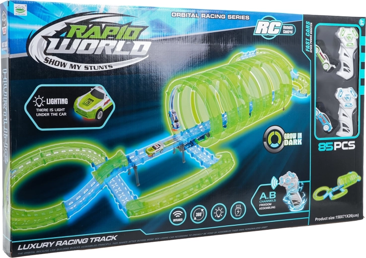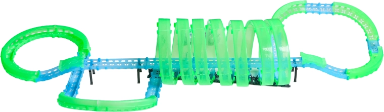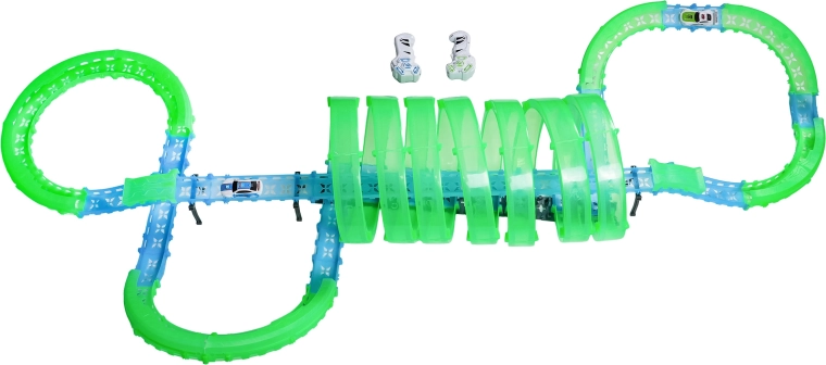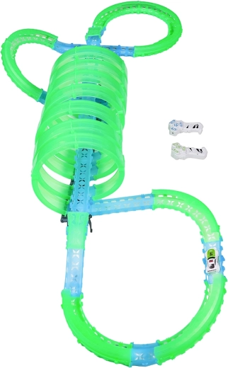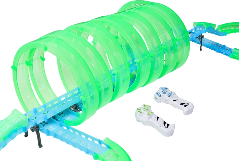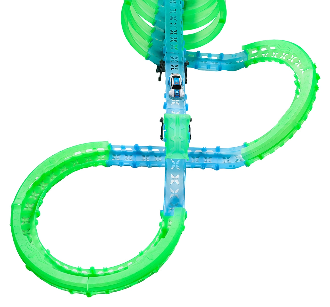 Ez a moduláris versenypálya fényvezető elemekből áll neonzöld és kék színben, könnyen összepattintható, és gyors átrendezést tesz lehetővé. A fluoreszkáló anyag megvilágítás után felragyog, és a LED-es kisautókkal együtt a szobát magával ragadó fényarénává változtatja.