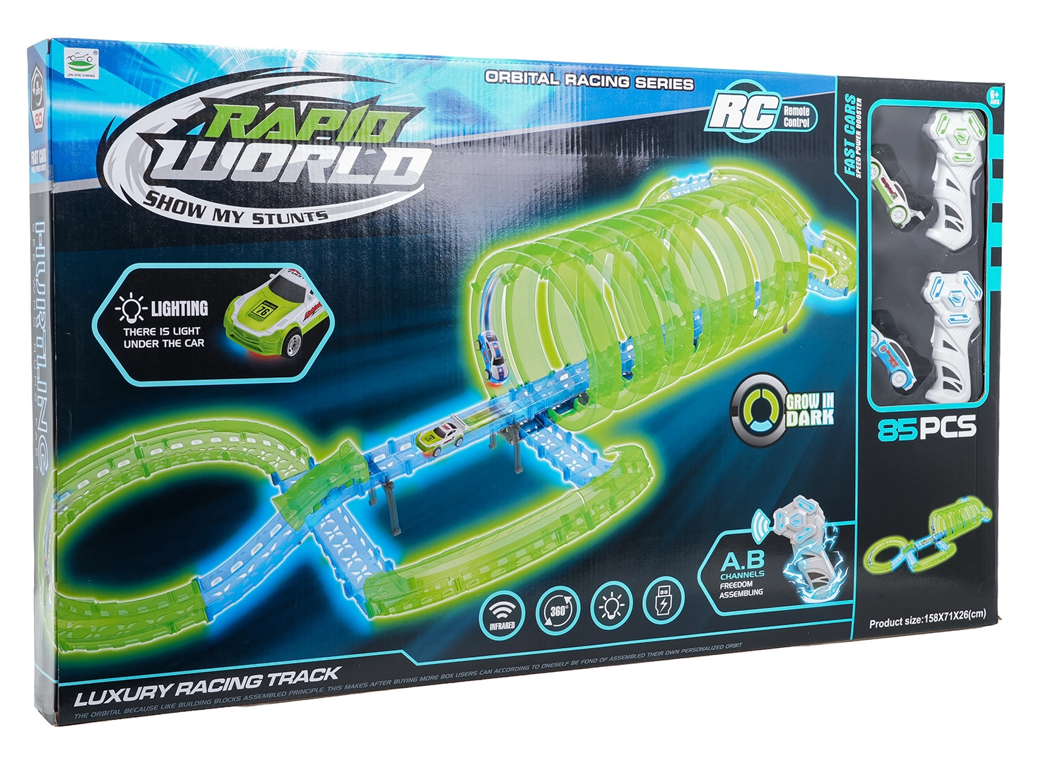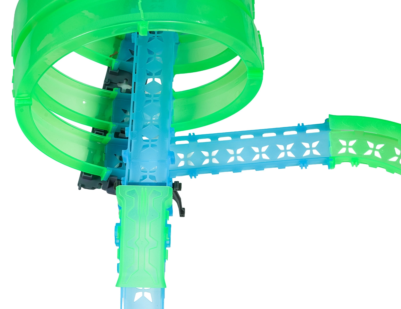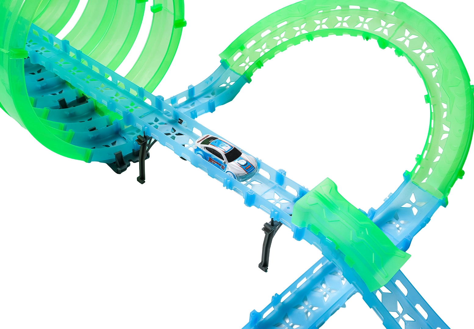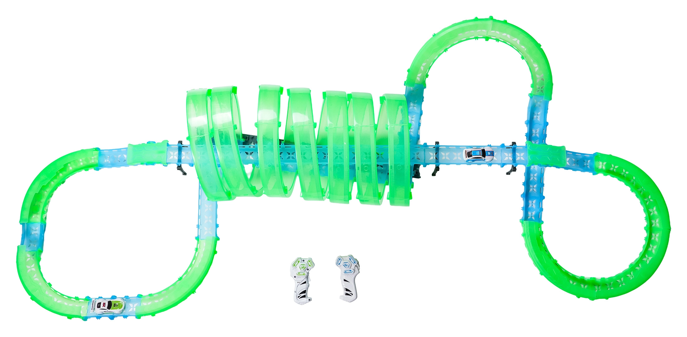 Ez a moduláris versenypálya fényvezető elemekből áll neonzöld és kék színben, könnyen összepattintható, és gyors átrendezést tesz lehetővé. A fluoreszkáló anyag megvilágítás után felragyog, és a LED-es kisautókkal együtt a szobát magával ragadó fényarénává változtatja.
