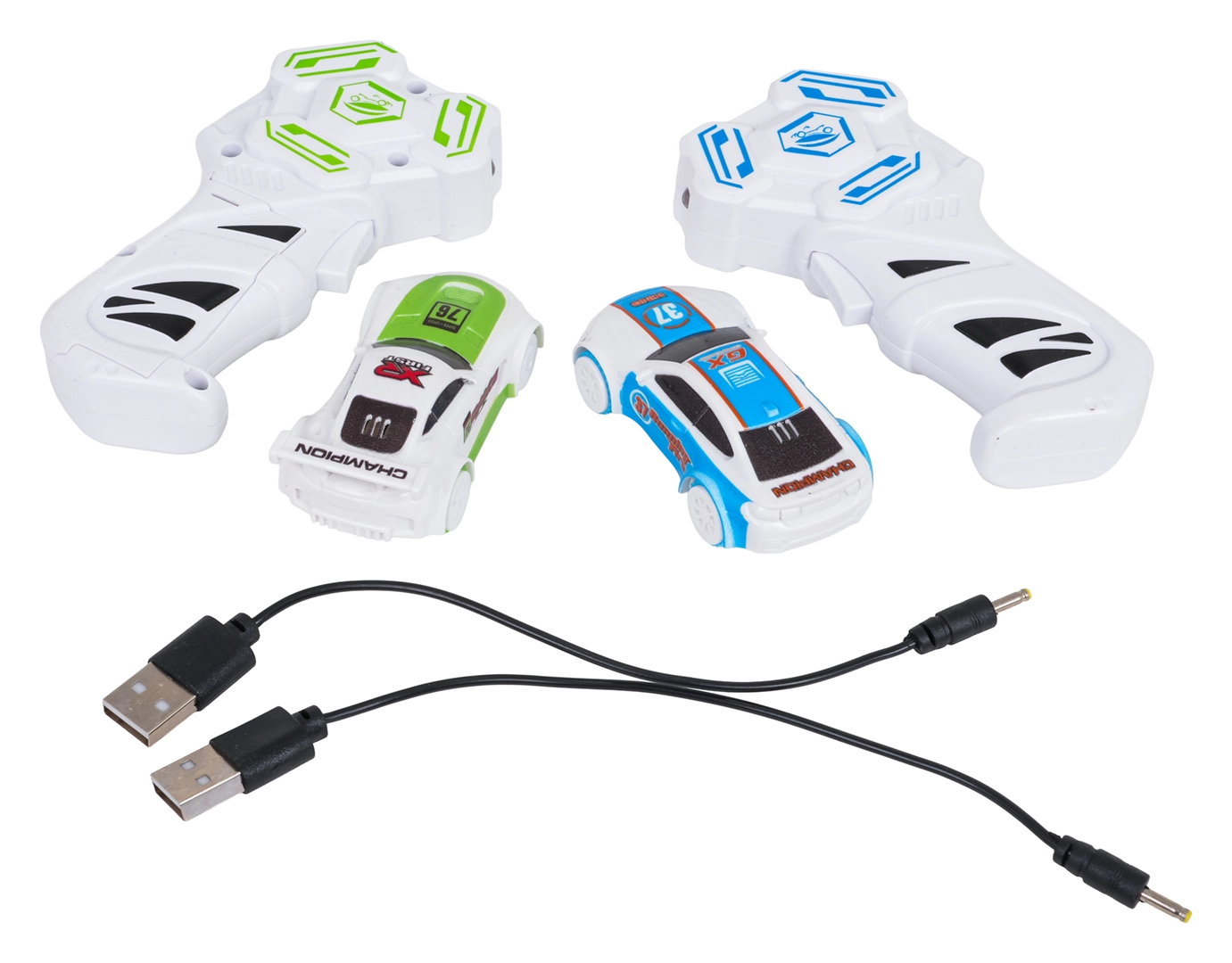 - 2 × kisautó, 2 × távirányító, 2 × USB töltőkábel, pályaépítő elemek, használati útmutató