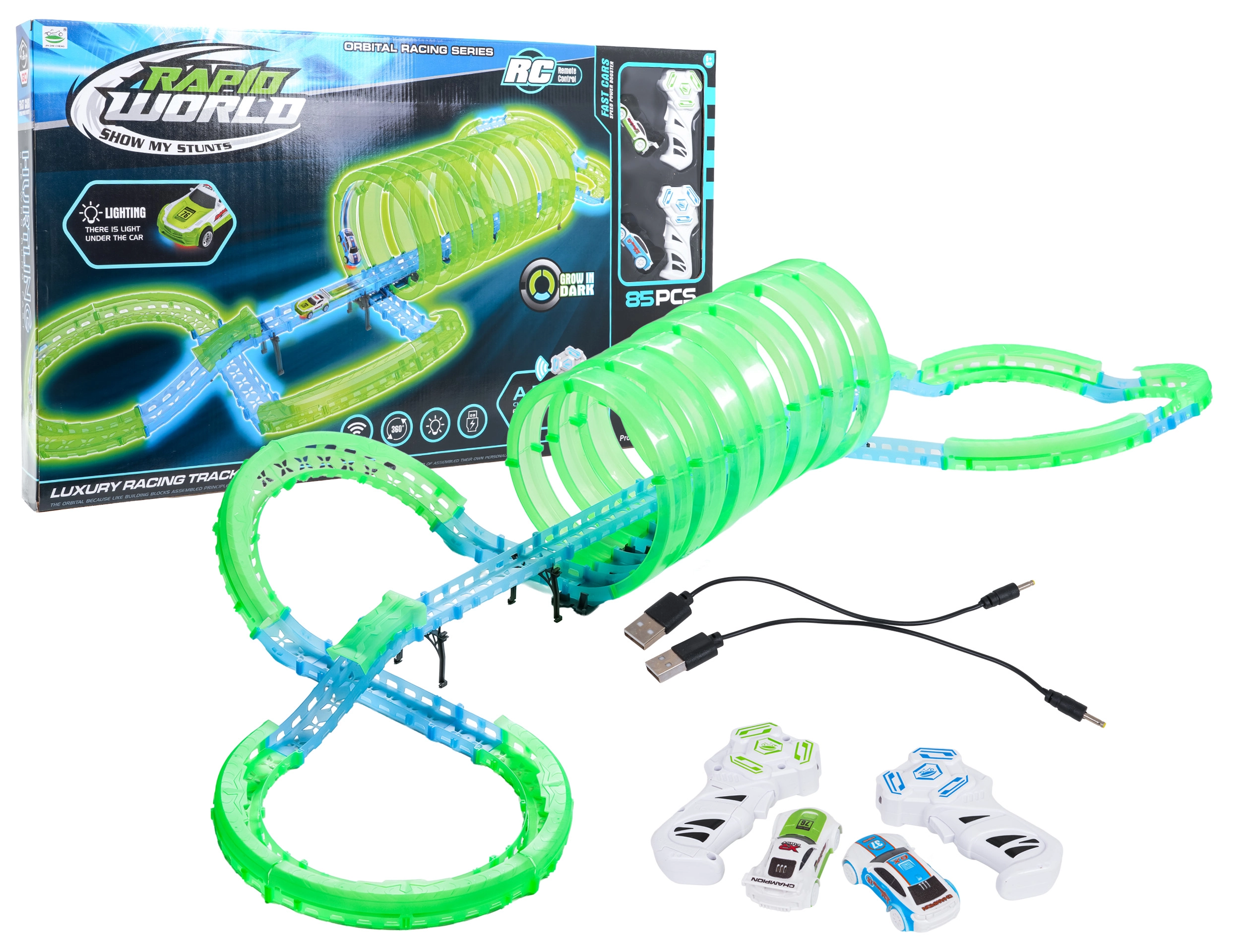 - fluoreszkáló pálya, LED-es autóvilágítás, több 360°-os hurok