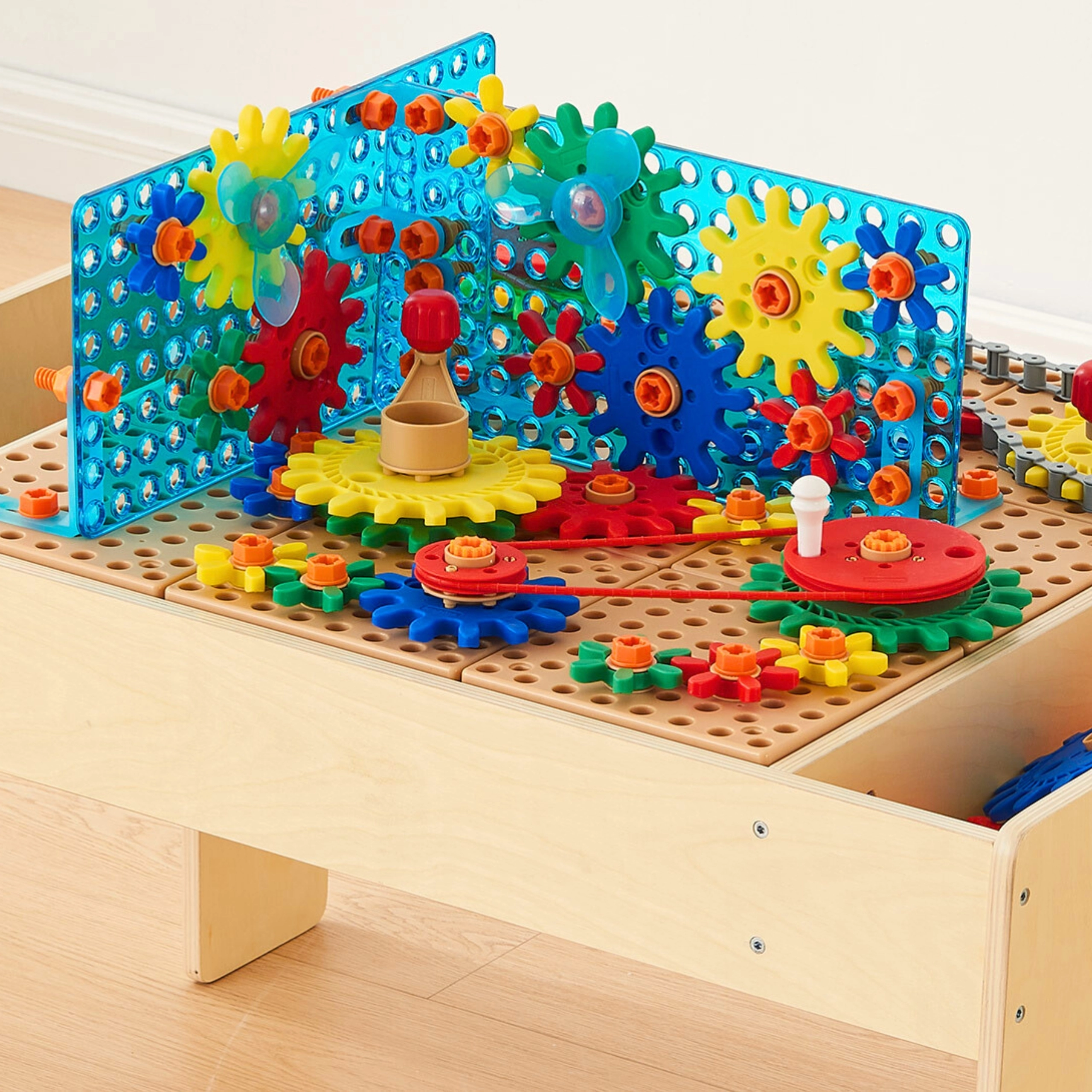 Az oldalsó tárolórekeszek áttekinthetően rendszerezve tartják a csavarokat, anyákat és hajtáselemeket, hogy a gyerekek a kreatív munkára összpontosíthassanak.