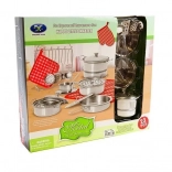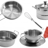 Teljes rozsdamentes acél gyermek konyhai készlet 23 darabbal, amely órákig tartó kreatív szórakozást és tanulást nyújt. Serpenyőt, fedeles lábasokat, konyhai eszközöket és textil kiegészítőket tartalmaz – mindezt fémes kivitelben, amely illik bármelyik gyerekkonyhába. Támogatja a finommotorikát, az együttműködést és a kreativitás fejlesztését. 3 éves kortól ajánlott, CE tanúsítvánnyal és EN 71 szabványnak megfelelően.