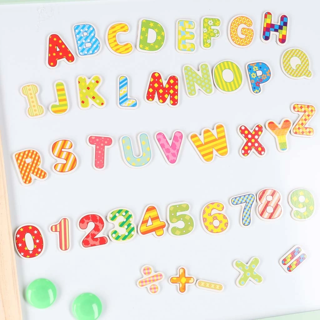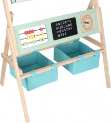 - 3 az 1-ben kétoldalas fa tábla 2 textil kosárral, 6× kréta, 6× zsírkréta, 2× mágnes, 3× mágneses marker, törlőszivacs, 41 mágnes (betűk és számok)